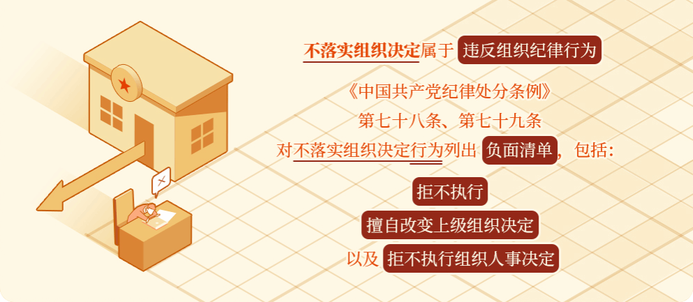 执行党的决定,服从组织分配,积极完成党的任务是党员必须履行的义务。不落实组织决定属于违反组织纪律行为。《中国共产党纪律处分条例》第七十八条、第七十九条对不落实组织决定行为列出负面清单,作出处分规定——