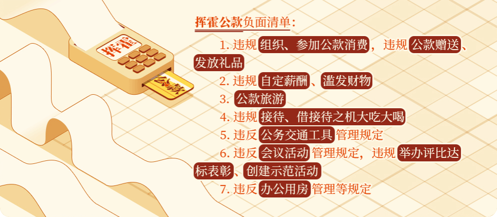 1.违规组织、参加公款消费,违规公款赠送、发放礼品。《条例》第一百一十三条规定,违反有关规定组织、参加用公款支付的宴请、娱乐、健身活动,或者用公款购买赠送或者发放礼品、消费卡(券)等,对直接责任者和领导责任者,情节较轻的,给予警告或者严重警告处分;情节较重的,给予撤销党内职务或者留党察看处分;情节严重的,给予开除党籍处分。