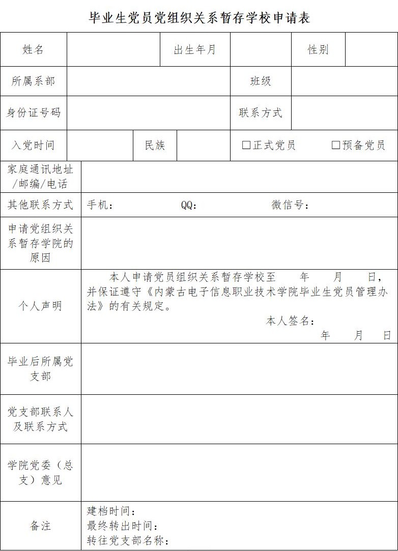 附表一 《毕业生党员党组织关系暂存学校申请表》