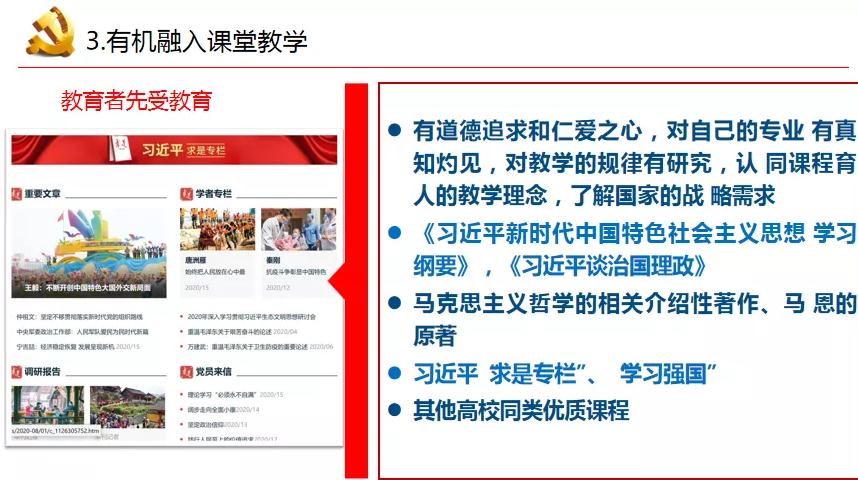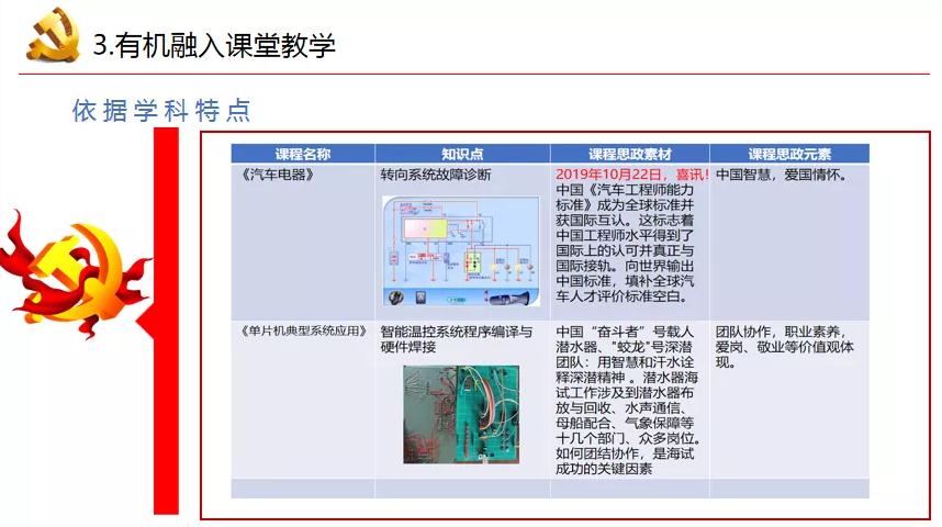 为贯彻落实全国高校思想政治工作会议精神,依据教育部印发《高等学校课程思政建设指导纲要》全面推进高校课程思政建设的要求,学校把课程思政建设作为教师党支部落实立德树人的重要任务来抓,课程思政成为教师党支部建设的有效载体。电子与自动化学院教师党支部坚持以党建为引领,以基层党建与教学科研双促进,双提升为目标,于11月26日下午,教师党支部书记宫艳丽以“挖掘课程思政元素,有机融入课堂教学”为主题向教师支部全体党员讲党课,发挥了教师党支部课程思政组织者和推动者的作用,把教师党支部推到了立德树人第一线,鼓励每一位专业课老师制定开展“课程思政”教学设计,努力做到课程门门有思政,教师人人讲育人。