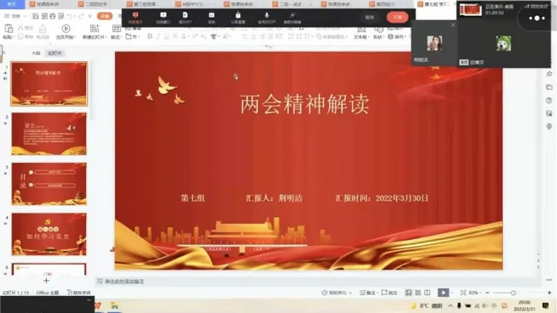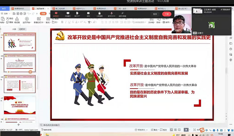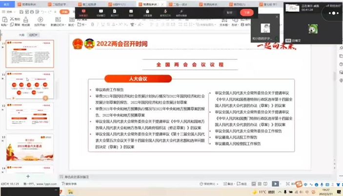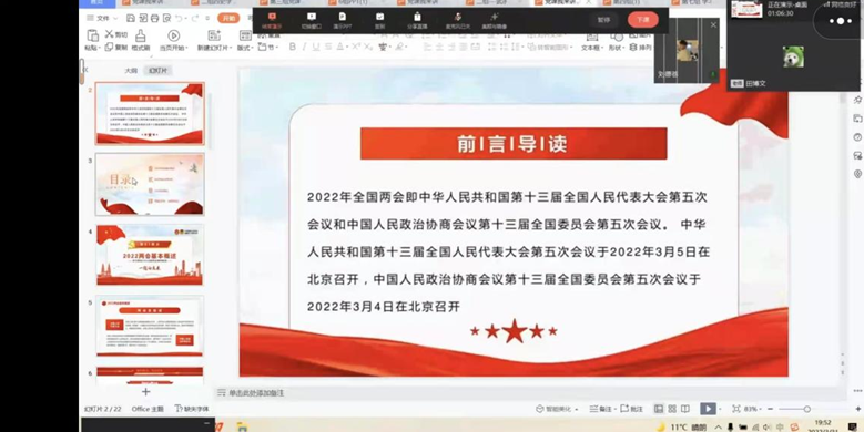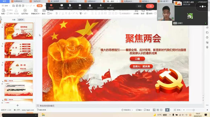 “党课我来讲”活动以“一个课件、一个主题、一个主讲人”的基本形式,分“两会、党史学习教育、普法、铸牢中华民族共同体意识”四种形式开展。同学们围绕这四点开始演讲。