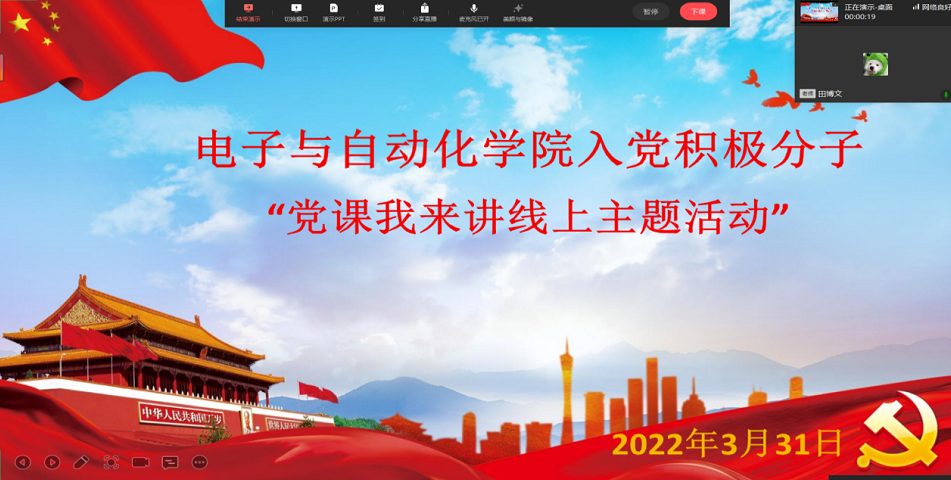 2022年3月31日下午7点,电子与自动化学院党总支积极分子在线上召开“党课我来讲”主题活动,参加会议的有电子与自动化学院党总支组织员李玉文老师以及第35、36期入党积极分子。