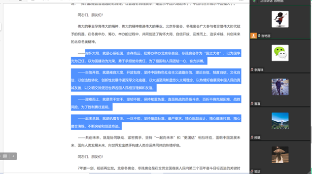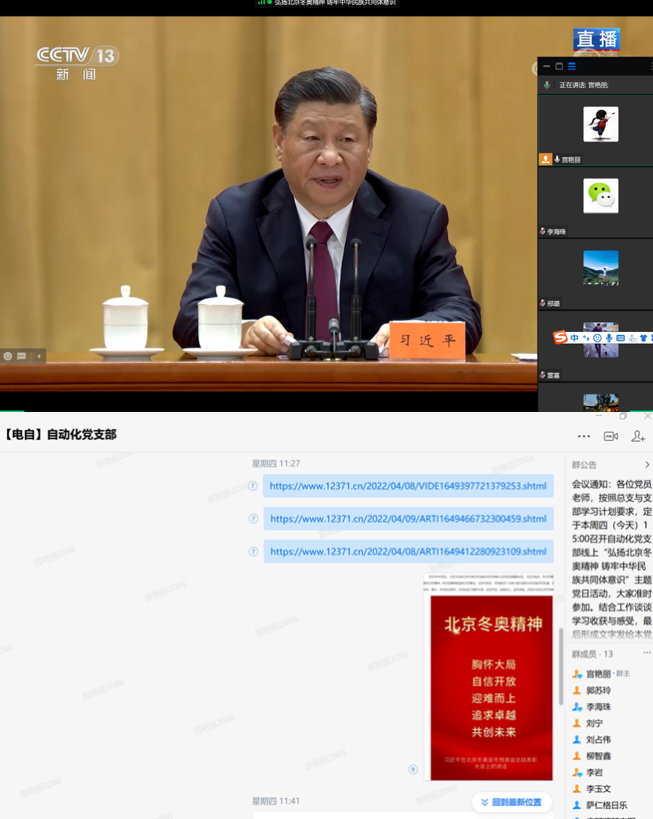 结合当前疫情防控政策,自动化支部于4月21日15:00召开自动化党支部线上“弘扬北京冬奥精神 铸牢中华民族共同体意识”主题党日活动。本次活动由党支部书记宫艳丽主持,自动化党支部全体党员参加本次活动。认真学习习近平在北京冬奥会冬残奥会总结表彰大会上的重要讲话精神,深刻领悟“胸怀大局、自信开放、迎难而上、追求卓越、共创未来”北京冬奥精神的意义。