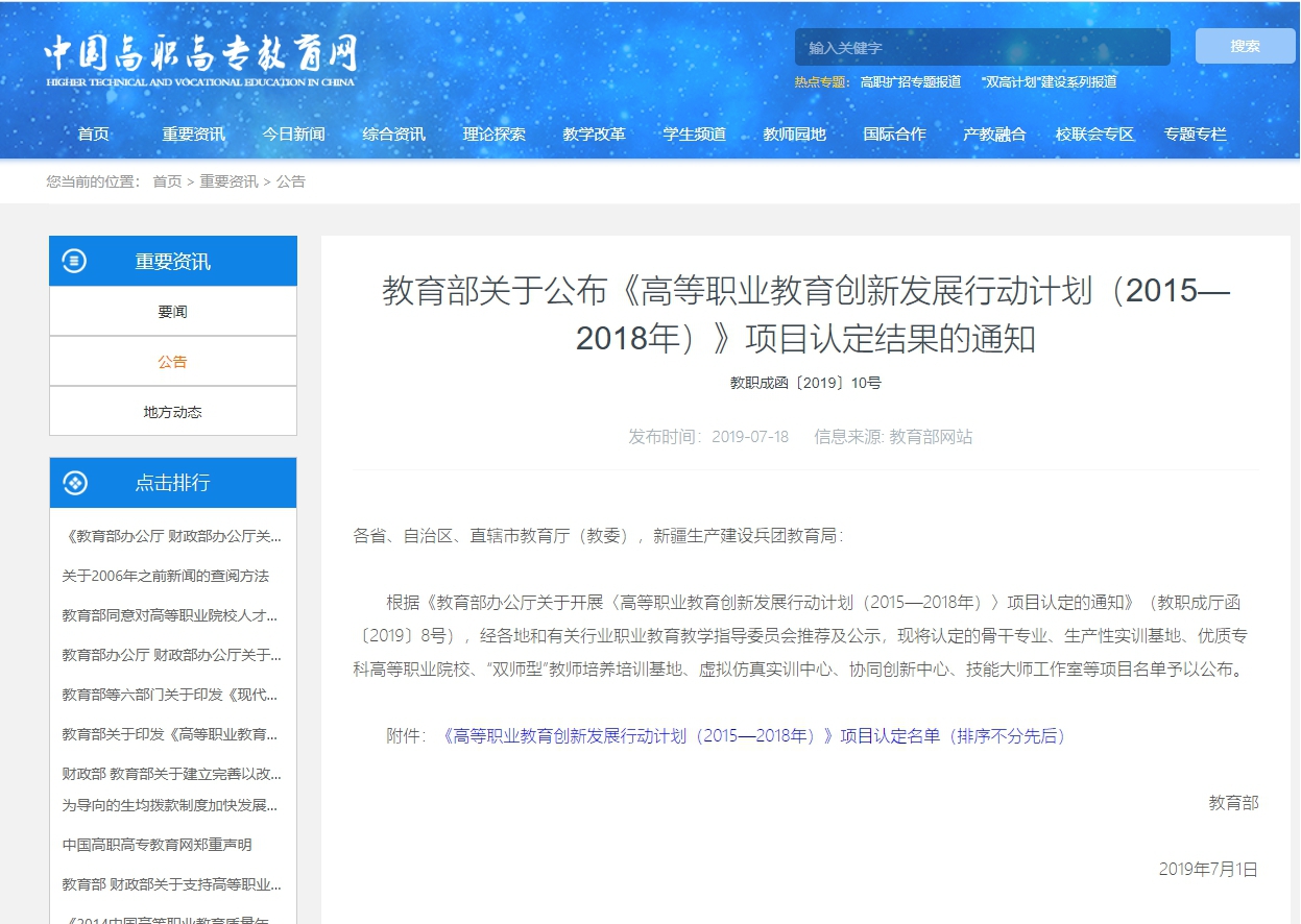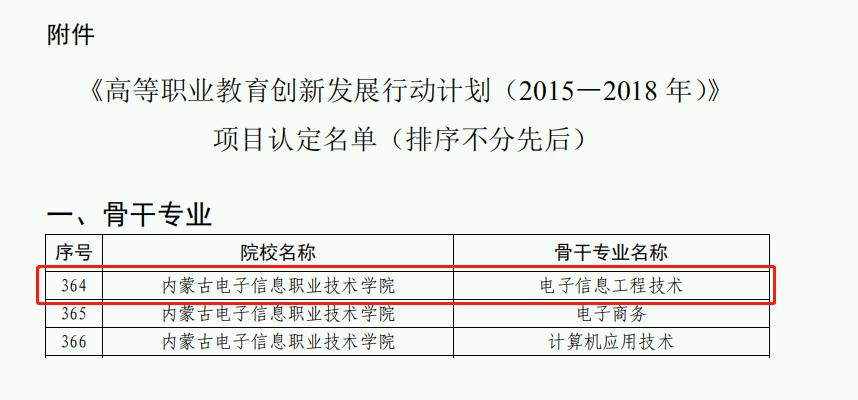 2019年,电子信息工程技术专业在《高等职业教育创新发展行动计划(2015-2018年)》项目中被认定为国家级骨干专业。