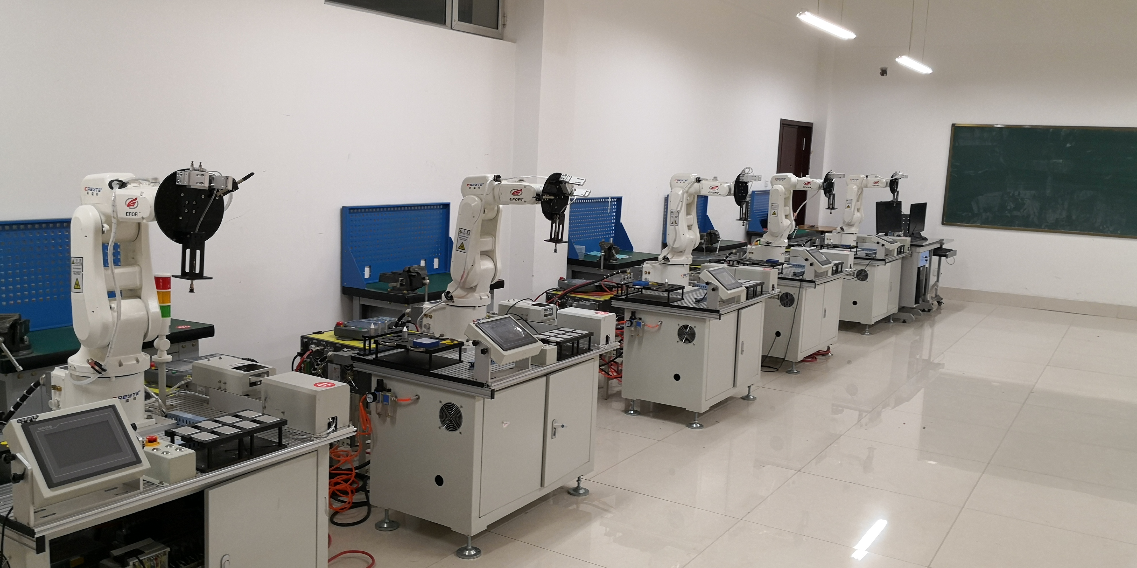 为充分体现职业学院的办学特色,重点以实用性、适用性、技能型、应用型为教学主线,适应职业学院办学要求,该实训室配备5套科瑞特公司生产的工业机器人实训台。每套实训台包括:机器人本体、机器人控制柜、电气控制柜等设备。可以实现:轨迹、搬运、码垛、冲压、写字等功能。