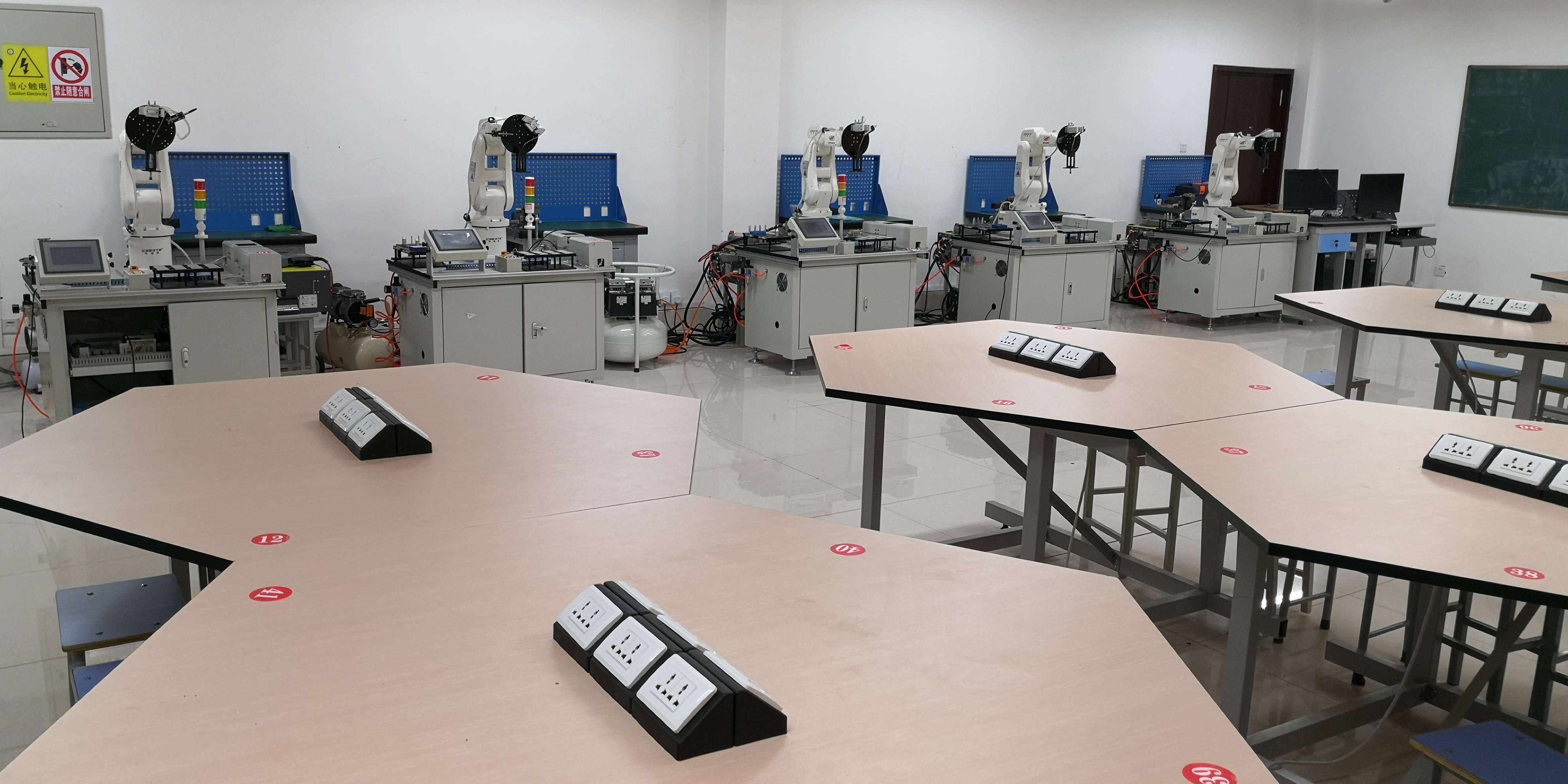 另外,该实训室还配备了6角桌,上边安装了插线板,方便学生以小组方式学习、讨论,还可以使用电脑来进行编程等操作。