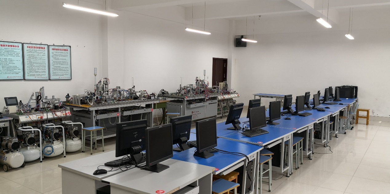实验室亚龙335B自动化生产线2套,英吉斯柔性生产线2套,共计4套。是自动化专业综合实训室。实训设备以西门子S7-200 PLC为核心控制器,同时,结合传感技术,液压与气动技术,电机控制技术等综合专业知识。培养学生掌握PLC复杂控制系统设计方法;具备机电一体化技术、变频技术、伺服技术、触摸屏等知识与PLC综合应用的能力、具备复杂PLC控制系统设计与规划能力;具备典型自动化生产线PLC控制系统安装、调试、维护能力。
