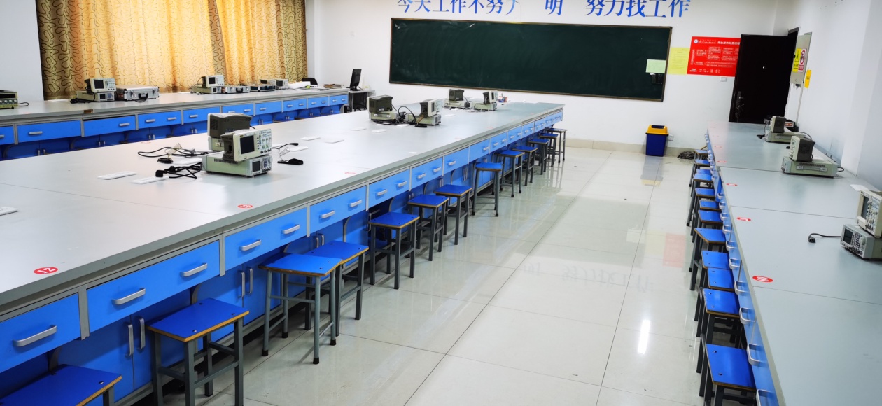 实验室配稳压电源、示波器、信号发生器等电路测试设备。通过在实验室里教师开设以项目制作为主的教学内容。通过此过程学生能进行电子产品焊接、组装和调试。更好培养基本电子元件识别与检测、典型电路图识别、常用仪器使用。