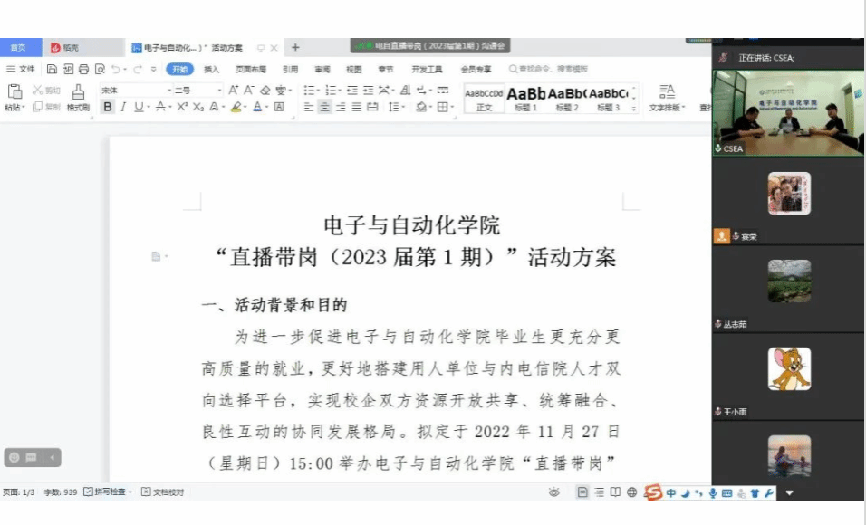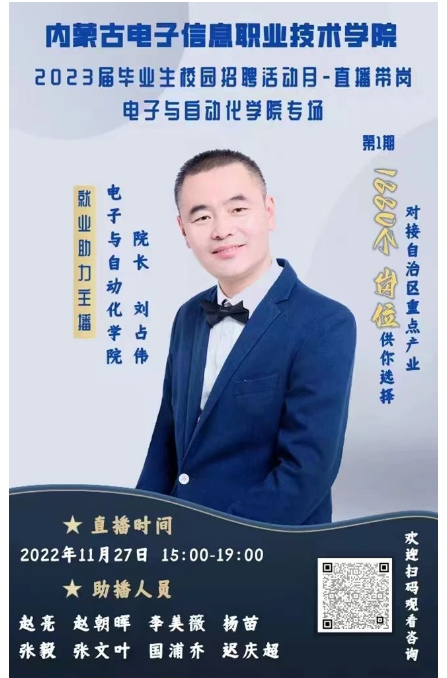 电子与自动化学院承办了内电信院“直播带岗(2023届第1期)”活动。为了确保本次活动在11月27日下午3:00顺利举行,11月25日晚,电子与自动化学院院长刘占伟,组织本次活动工作人员,同时邀请8家企业相关负责人进行了线上沟通交流。内蒙古电子信息职业技术学院招就处李金玺列席了会议。