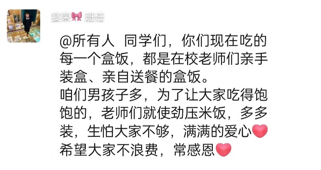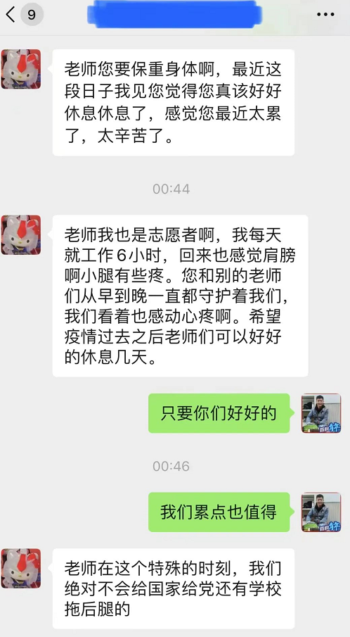 这些天来,我们深切感受到了学校为了同学们的生命安全和身体健康全力以赴的担当,深切感受到了教师志愿者们为了疫情防控日夜兼程的辛劳,深切感受到了教师志愿者为了同学们的学习生活夜以继日的奉献。虽然疫情一定程度上影响了我们的日常生活,但是学校的积极努力和志愿者老师们的无私奉献,让我们内心充满了温暖和感动。