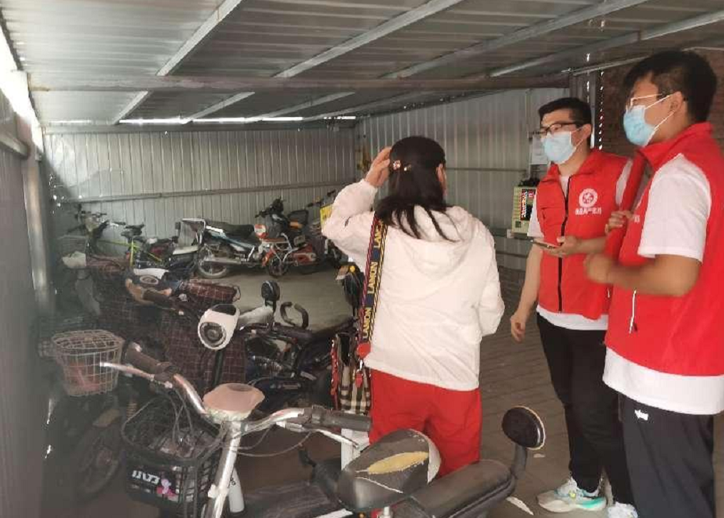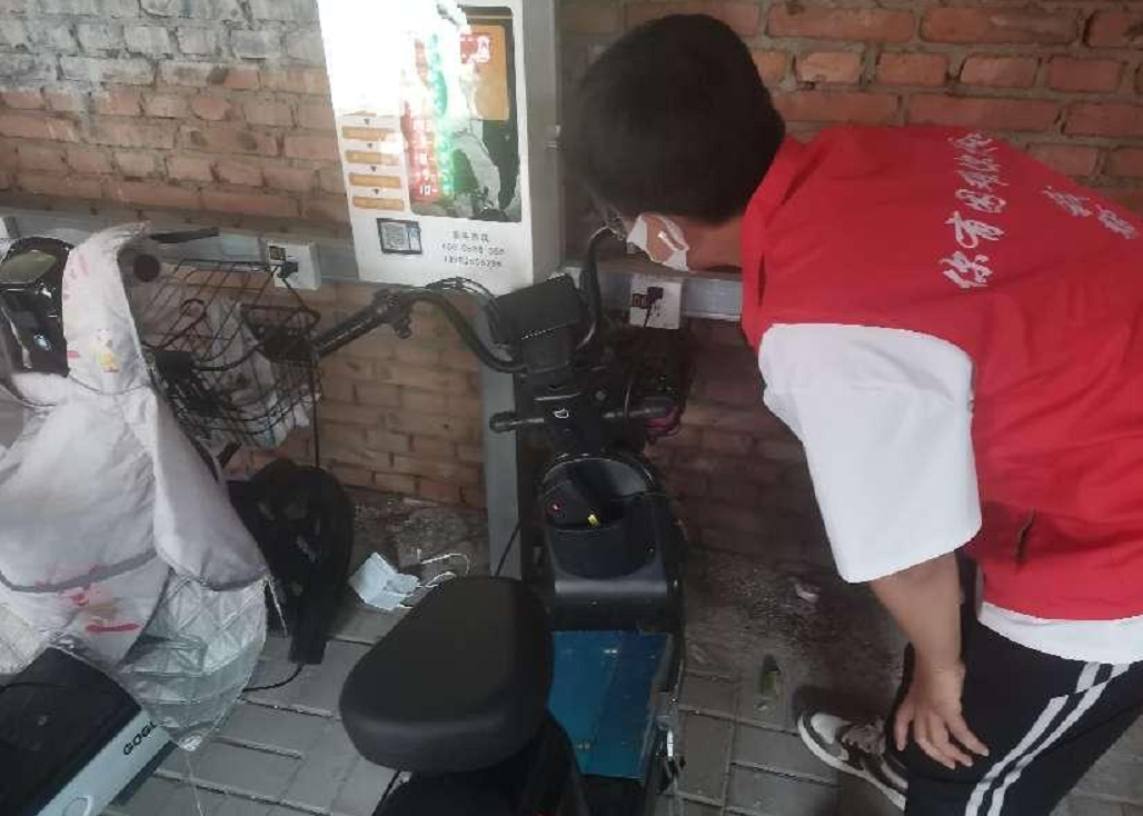 志愿者们在社区的电动车充电棚中遇到了刚刚给电瓶车充完电的王阿姨,志愿者们发现王阿姨在给电动车充电的时候并没有把插头插牢固,而且电动车的电瓶也有明显的老化与电路裸露现象。志愿者们发现该状况,及时将电动车用电隐患情况告知王阿姨,并给王阿姨普及安全用电知识。