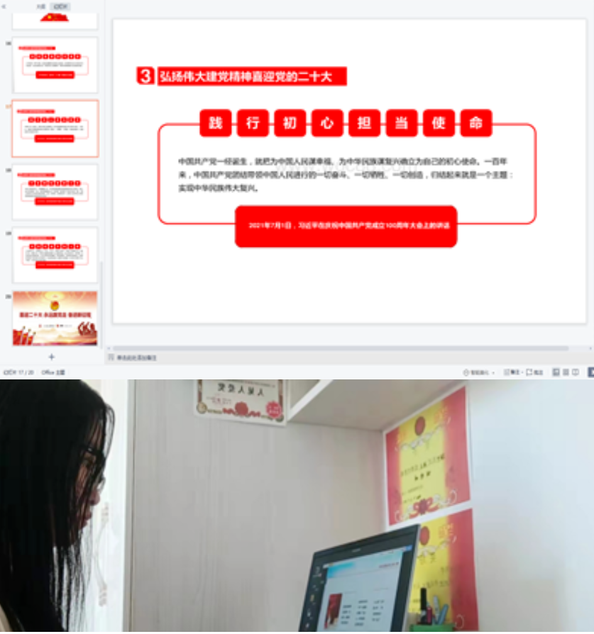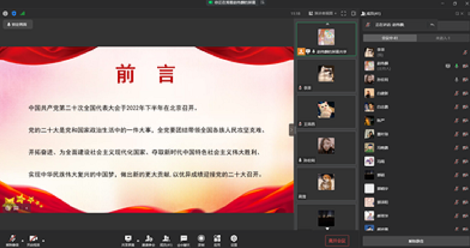 本次团日活动以团支书讲解、观看视频、分享交流等多种形式通过企业微信线上直播进行。活动中,青年团员们一同观看了视频《中国共产党百年述职报告》,重温了中国共产党的百年奋斗历程;学习了七一勋章获得者王占山、马毛姐的光辉事迹,增强了团员们的爱党爱国精神;在各团支书的带领下重温入团誓词,学习了抗疫英雄的先进事迹,进一步增强了共青团员的身份意识和责任意识。团员们纷纷表示作为新时代的团员青年要青春向党,奋斗强国,要用不懈奋斗践行“请党放心,强国有我”庄严承诺。