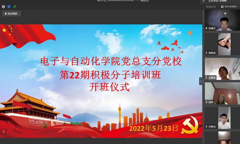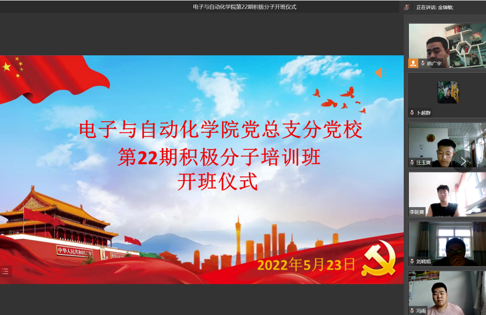 2022年5月23日下午,以线上形式,电子与自动化学院党总支分党校第二十二期积极分子培训班举行开班仪式,学院党总支副书记、学生党支部书记石磊,党总支组织员、学生党支部组织委员李玉文、学生党支部宣传委员金瑞敏及第二十二期69名积极分子参加了开班仪式,开班仪式由李玉文主持。