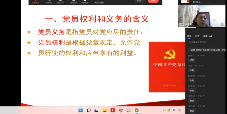 开班仪式结束后,党总支组织员李玉文老师线上,做《党员的权力和义务》为题的专题讲座,要求所有入党积极分子,端正入党动机,对党尽责,发挥引领作用,早日成为一名光荣的中国共产党员。