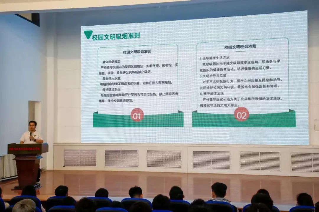 习近平总书记殷切嘱托青年大学生要“立大志、明大德、成大才、担大任”。健康的体魄是实现这一切的基石,吸烟不仅危害自身健康,更与文明校园的建设相悖。动员大会上,电子与自动化系学生科长罗金刚,团总支书记邢璐号召同学们积极响应习近平总书记对青年的号召,以青春之我,创建健康校园,从拒绝吸烟做起,以实际行动创建健康校园,展现新时代大学生的卓越风采。