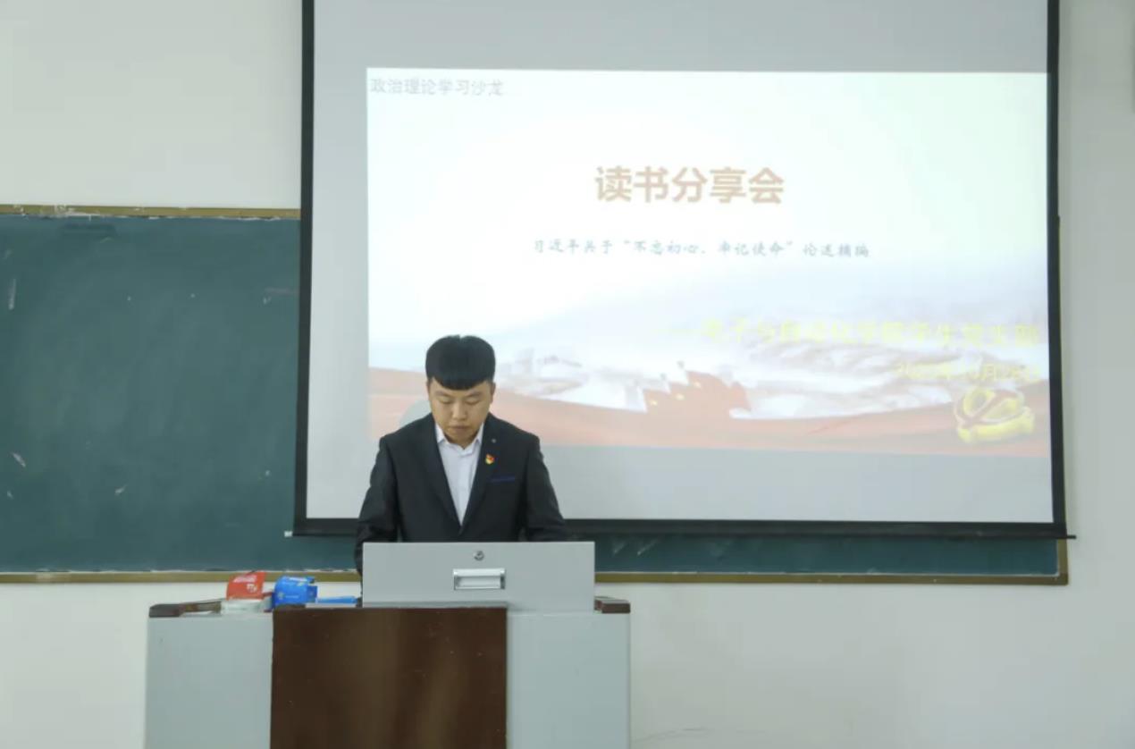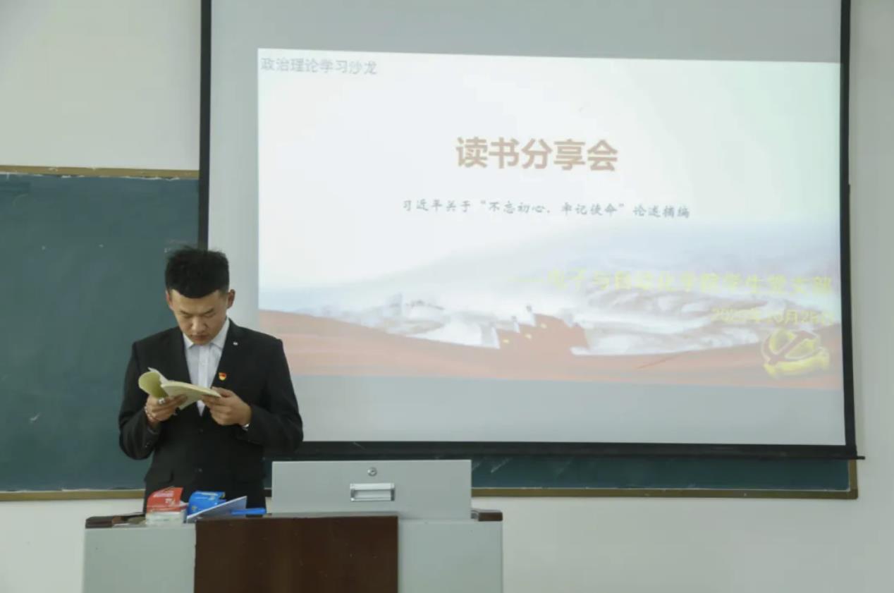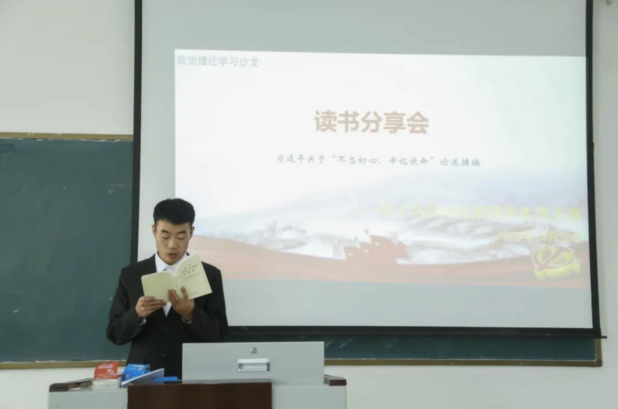 会上伊始,学生党员代表包俊首先为各位学生党员进行了读书分享,包俊分享的书籍为《习近平关于“不忘初心、牢记使命”论述摘编》,并选取中国共产党人的初心和使命,就是为中国人民谋幸福,为中华民族谋复兴等内容做了详细介绍。之后,各位学生党员轮流上台对自己所选取的段落进行了朗读,并互相分享了自身对于“不忘初心、牢记使命”相关论述的感想和读书的收获。最后,学生党员代表包俊号召大家用只争朝夕的精神去学习去奋斗,获得了与会学生党员们的一致好评。
