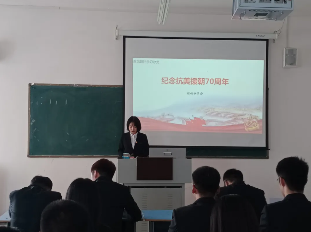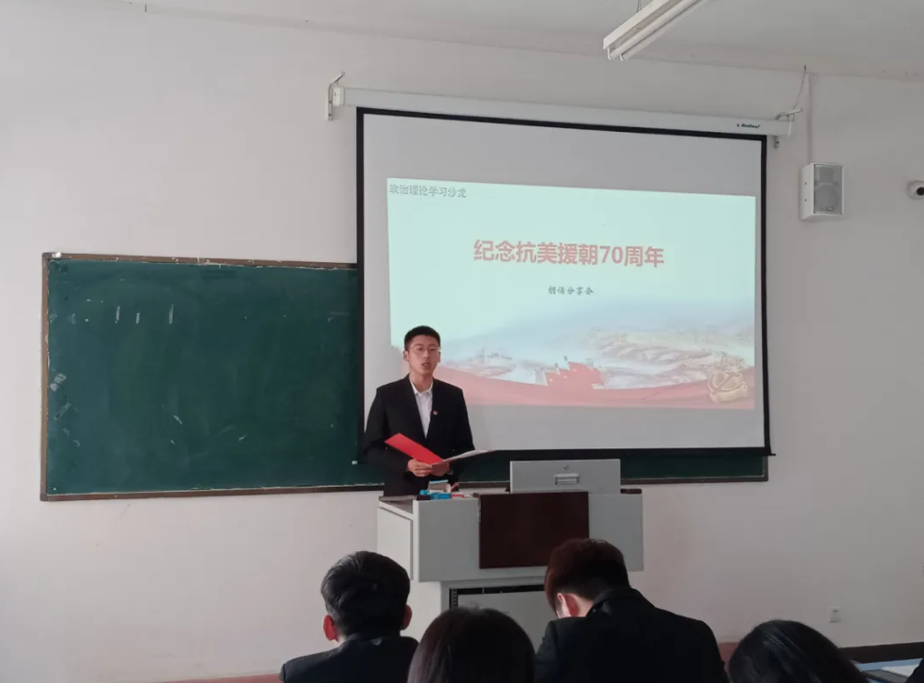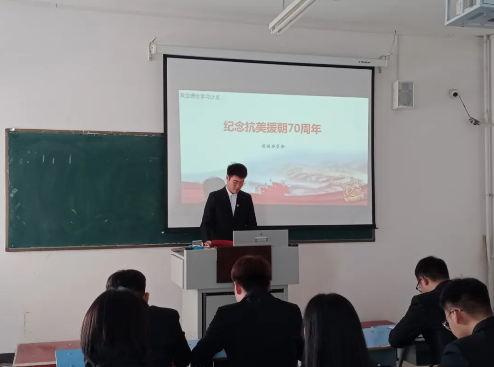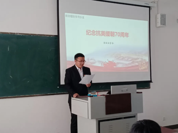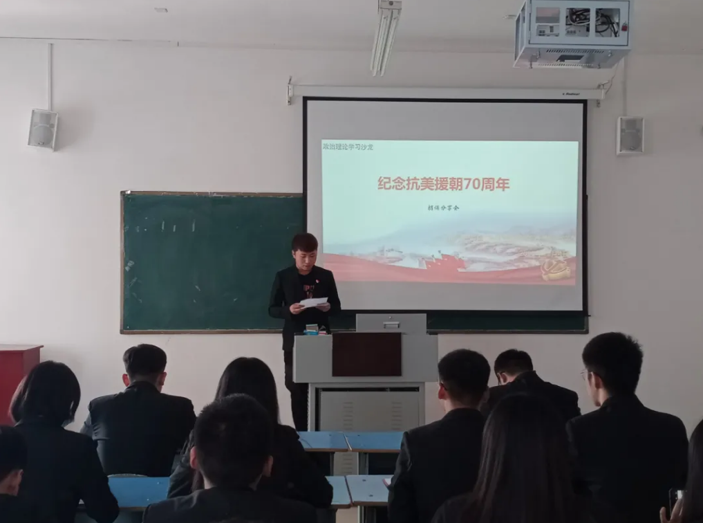 为纪念中国人民志愿军抗美援朝出国作战70周年,加强学生爱国主义教育,弘扬伟大抗美援朝精神,向英雄致敬。电子与自动化学院学生党支部于2020年11月4日12:30,在教学楼B214举办了以“纪念抗美援朝70周年”为主题的第三期政治理论学习沙龙——“诗歌朗诵会”。本次活动由学生党员代表张文浩主持的,部分学生党员和积极分子参加。
