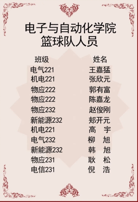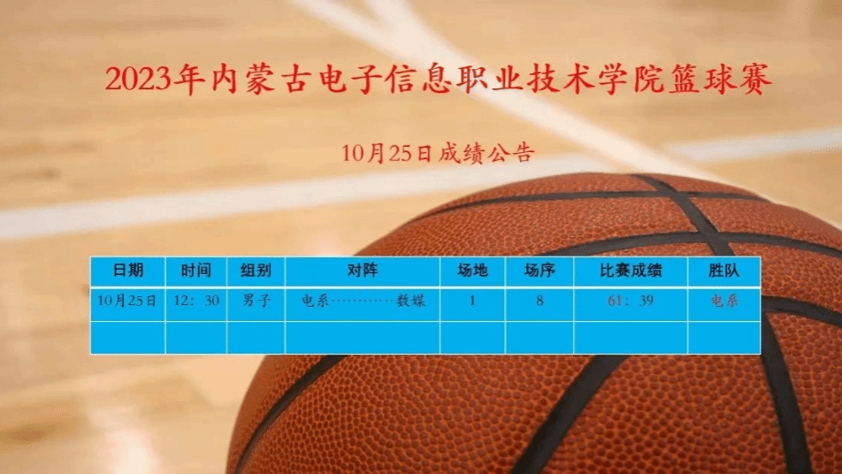 为积极响应学校号召,电子与自动化学院组建篮球队参加了2023年内蒙古电子信息职业技术学院篮球比赛。本次篮球比赛共有5支参赛队伍,电子与自动化学院篮球队11名学生运动员在教练员老师黄倩文的带领下参加本次比赛,运动员们一路过关斩将取得了第一名的优异成绩!