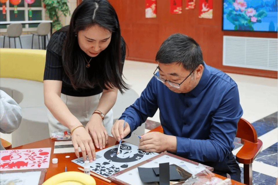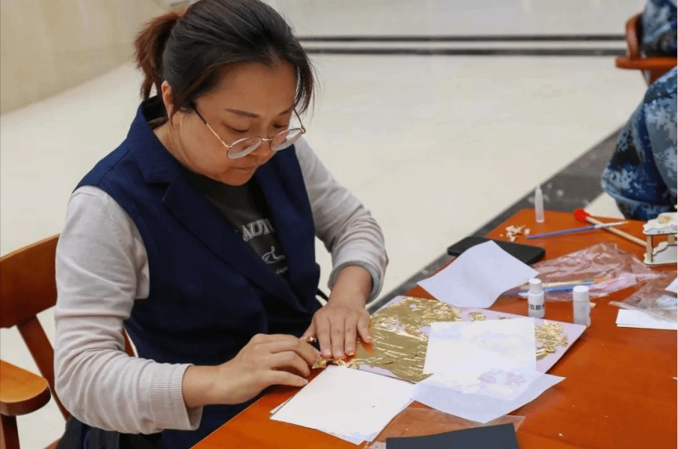 分享结束后,同学们开始动手制作灯笼和非遗金箔画。在老师的悉心指导下,大家充分发挥创意,制作出了一盏盏精美的灯笼和一幅幅璀璨的金箔画。这些作品不仅展示了同学们的才艺,也为活动现场增添了浓厚的节日气氛。