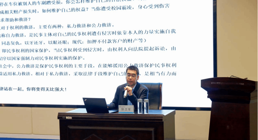 郭院长特别强调了法律意识在大学生成长成才过程中的重要性。他指出,作为新时代的大学生,不仅要专注于专业知识的学习,更要懂得运用法律武器保护自己的合法权益,同时也要严格遵守法律法规,做一名知法、守法、用法的好公民