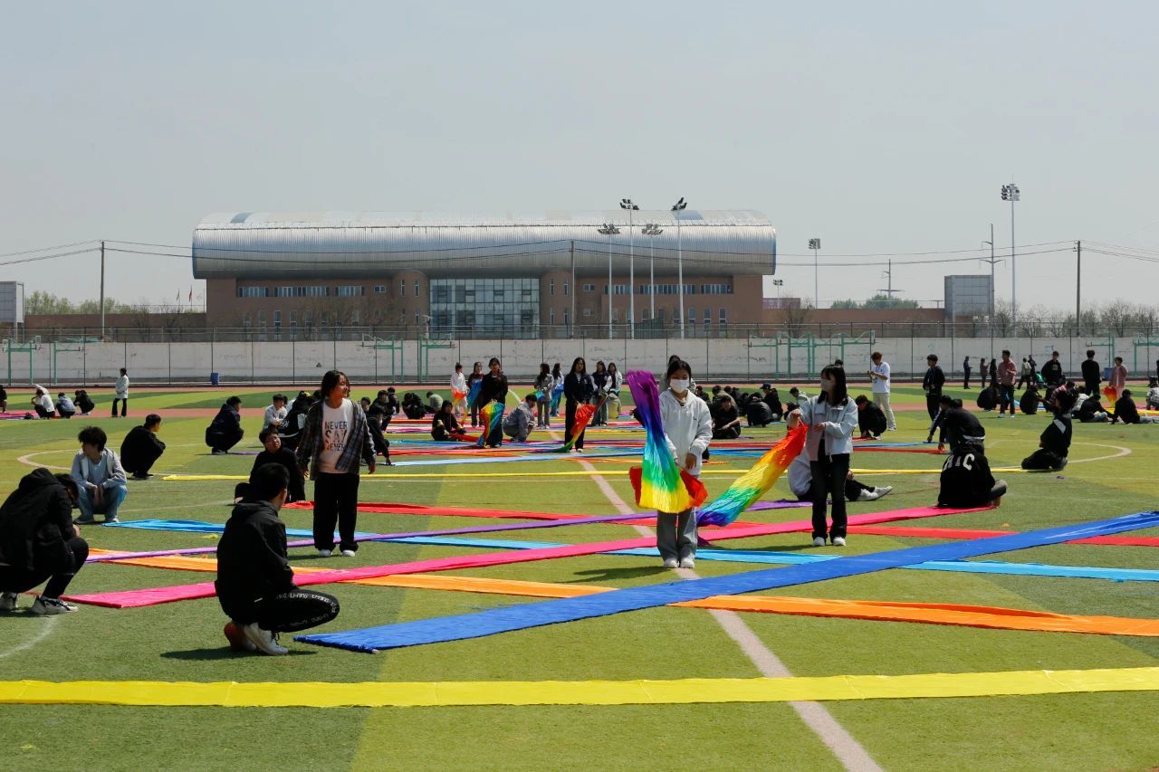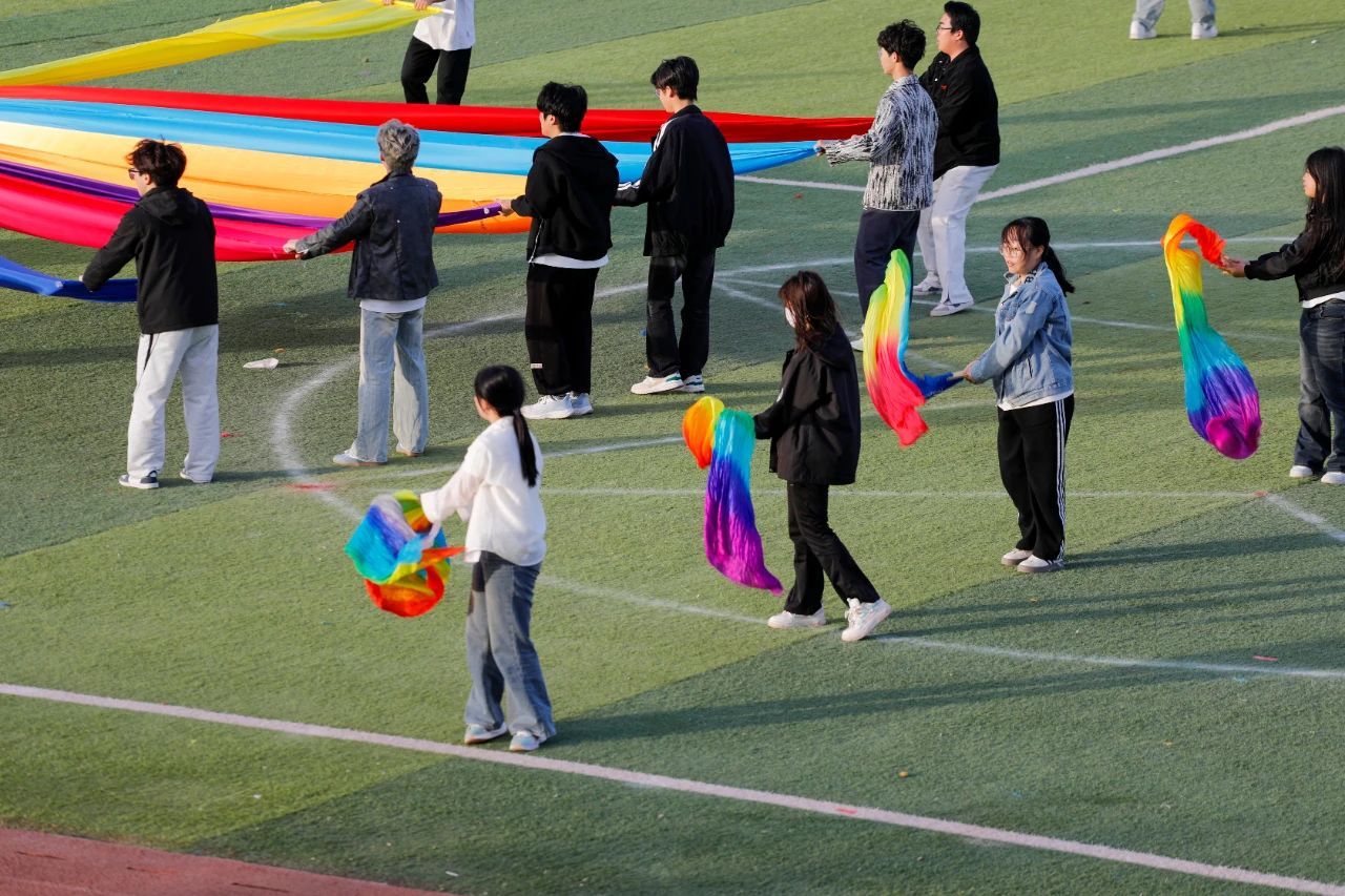 彩排现场,学生们不断变换着造型。彩带如花瓣般舒展,时而组成绽放的花朵,;时而排列成整齐的方阵,彩带似飘扬的旗帜。