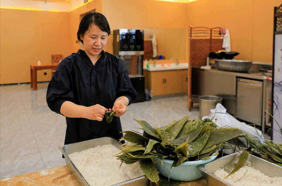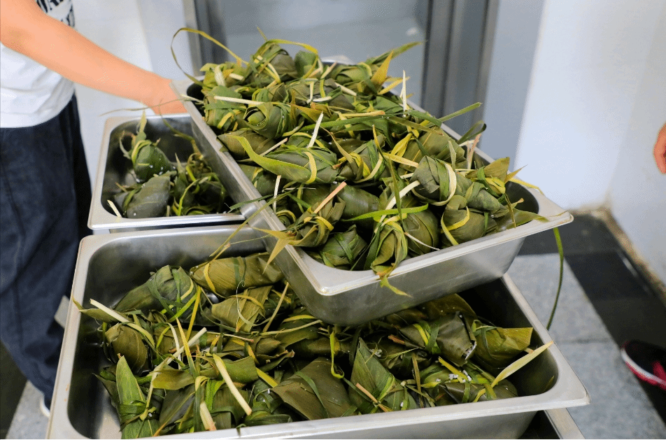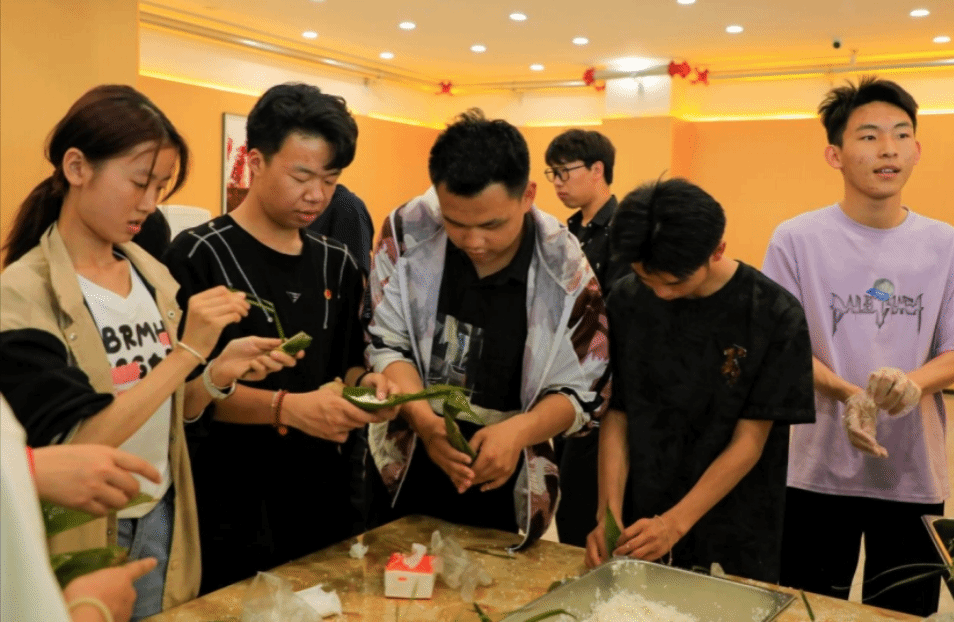 活动现场,糯米、红枣、粽叶等食材整齐排列,浓郁的节日氛围扑面而来。师生们围坐一堂,兴致盎然地投入包粽子环节。经验丰富的老师化身“非遗导师”,一边示范一边耐心讲解:“粽叶要先卷成漏斗状,放糯米时注意压实,绑线力度要适中。”学子们目不转睛地学习模仿,尽管起初手法略显生疏,包出的粽子形态各异,但在互帮互助中逐渐掌握技巧。随着一双双巧手上下翻飞,棱角分明的三角粽、饱满紧实的四角粽相继成型,粽叶的清香与糯米的甜香交织弥漫,勾勒出一幅温馨和谐的校园端午画卷。
