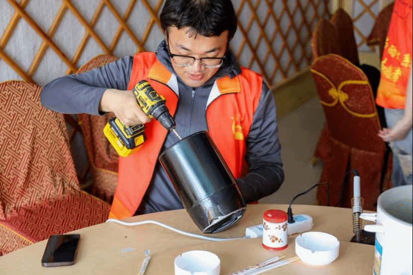抵达牧区后,同学们迅速投入家电维修工作。牧民们居住分散,但得知有专业师生前来维修,纷纷带着故障的电视机、洗衣机、电水壶等家电赶来。同学们分工忙碌:有人修理电热锅,在积灰线路间摸索,用万用表检测接口;有人调试电水壶,零件按序摆放,拆装机身时螺丝刀轻响不停。遇复杂电路问题,几人围在一起讨论,直到找到解决方法再动手。