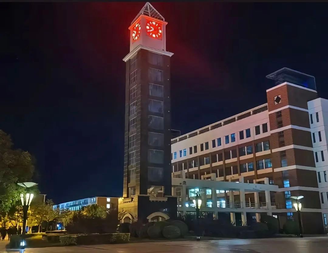 钟楼的红色钟面格外醒目,建筑外墙灯光与高雅路灯相互映衬。楼下道路开阔,绿植环绕,偶有行人身影。这画面定格着校园的夜 。