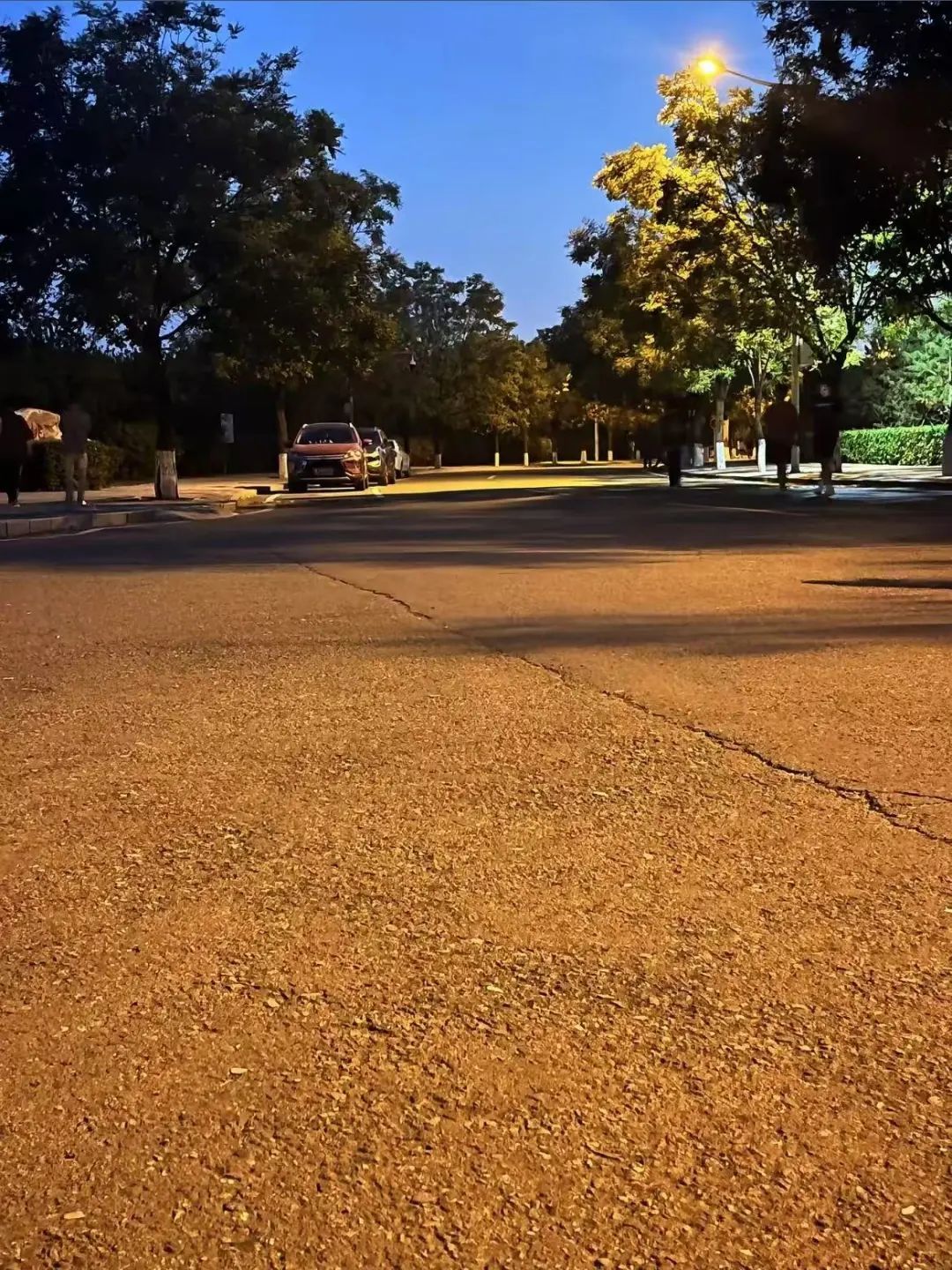 傍晚被折叠的寂静,悄然晕染了天际。昏黄的路灯散发出柔和光芒,似点点繁星洒落人间,温柔地勾勒出树木的轮廓。柏油路面泛着暖光,几道裂痕似岁月的纹理,承载着过往的故事。车静静停靠,如夜的守护者。偶尔路过的同学,为这静谧之景添了几分灵动。
