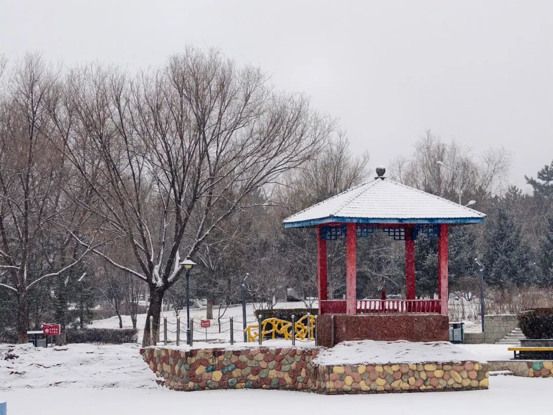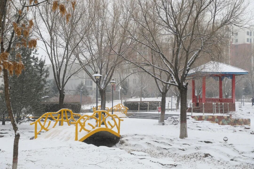 红柱蓝檐的凉亭顶着厚雪,彩色石基在白茫中晕出温润的质感,不远处的黄色镂空小桥卧在雪地上,与凉亭遥遥相望。另一处凉亭同样被白雪包裹,红亭在枯树的映衬下,成了雪色里最亮眼的点缀。雪花落在亭檐、桥身,沙沙的落雪声里,中式园林的婉约诗意在校园里缓缓流淌。