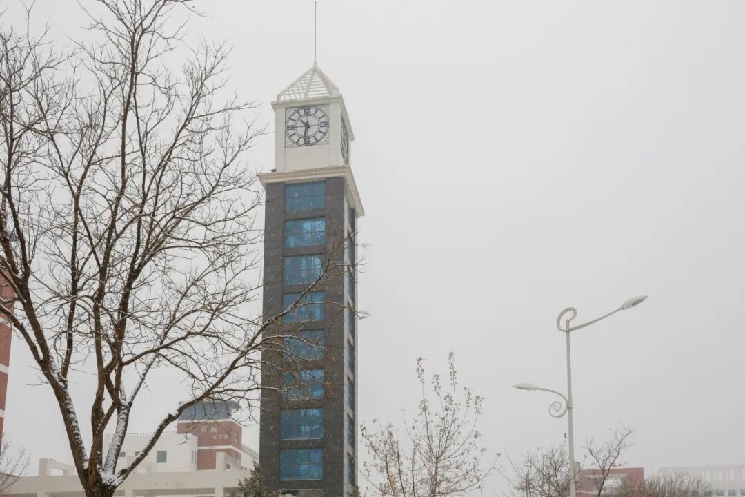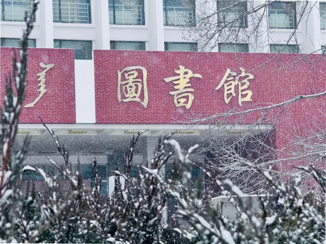 图书馆的红墙金字在雪雾中若隐若现,雪粒落在枝桠间,将馆名衬得愈发庄重;一旁的教学楼红白相间,硬朗的建筑线条在白雪的柔化下多了几分暖意,红阶白栏覆着薄雪,仿佛在等待学子们踏雪而来。图书馆的墨香与教学楼的书声,在初雪的笼罩下,汇成了校园里最动人的旋律。