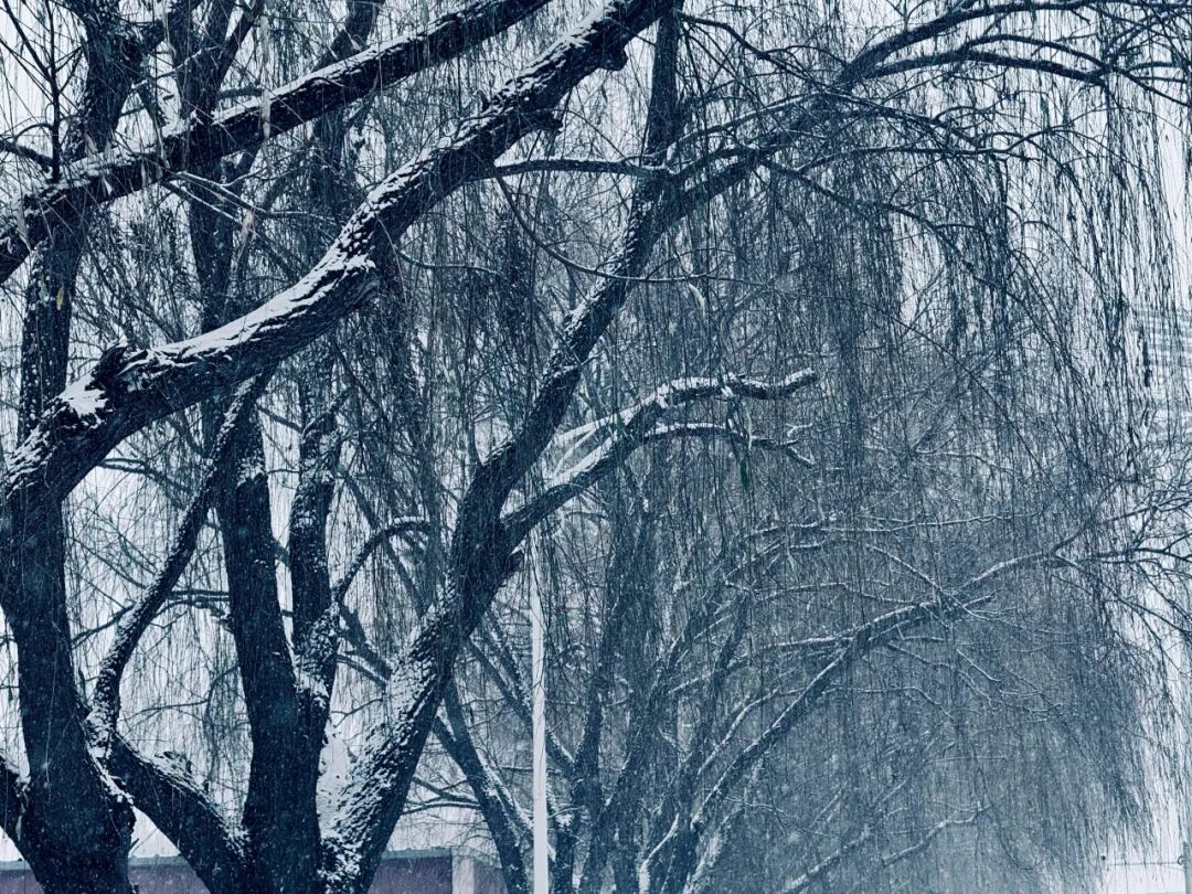 钟楼笔直地伫立在雪雾中,深色楼体搭配覆雪的白色钟面,指针仿佛在雪景里放慢了脚步。光秃的树枝在旁伸展,雪粒挂在枝桠间,与钟楼的硬朗线条交织出静谧的画面。雪花簌簌落在钟楼上,每一层蓝色玻璃都映着朦胧的雪色,这一刻,时光仿佛被初雪定格。