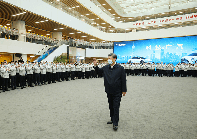 习近平随后来到广汽埃安新能源汽车股份有限公司考察。他走进企业展厅、总装车间、电池生产车间等,了解企业突破关键核心技术和推动制造业高端化、智能化、绿色化等进展情况。在广汽研究院,习近平仔细察看智能网联实验室、模型设计实验室等,并同科技人员、企业家、职工、外资企业代表等交流。习近平指出,中国改革开放政策将长久不变,永远不会自己关上开放的大门。一切愿意与我们合作共赢的国家,我们都愿意与他们相向而行,推动世界经济共同繁荣发展。习近平强调,中国是个大国,要重视实体经济,走自力更生之路。关键核心技术要立足自主研发,也欢迎国际合作。要加强教育和人才培养,夯实科技自立自强根基。
