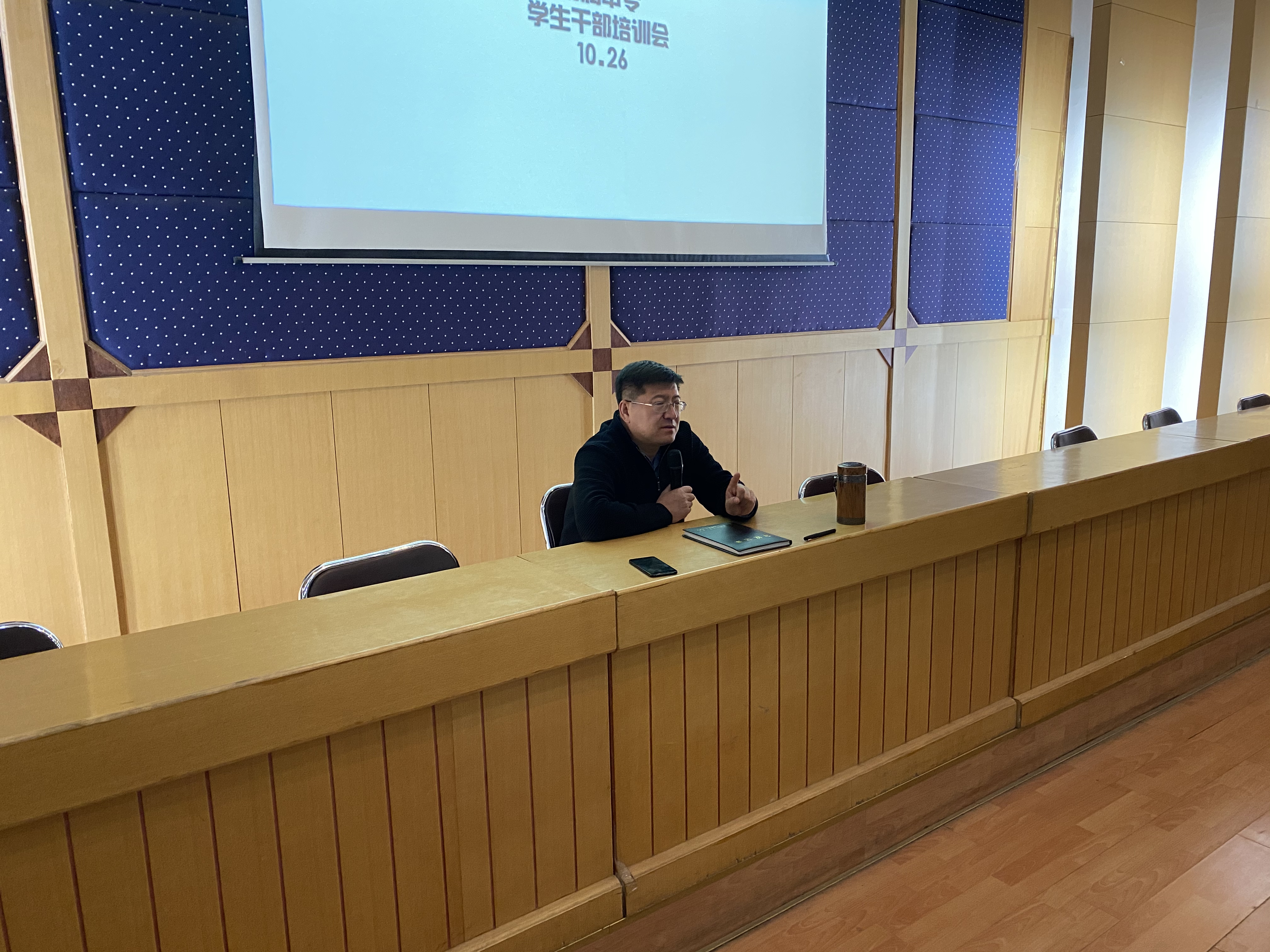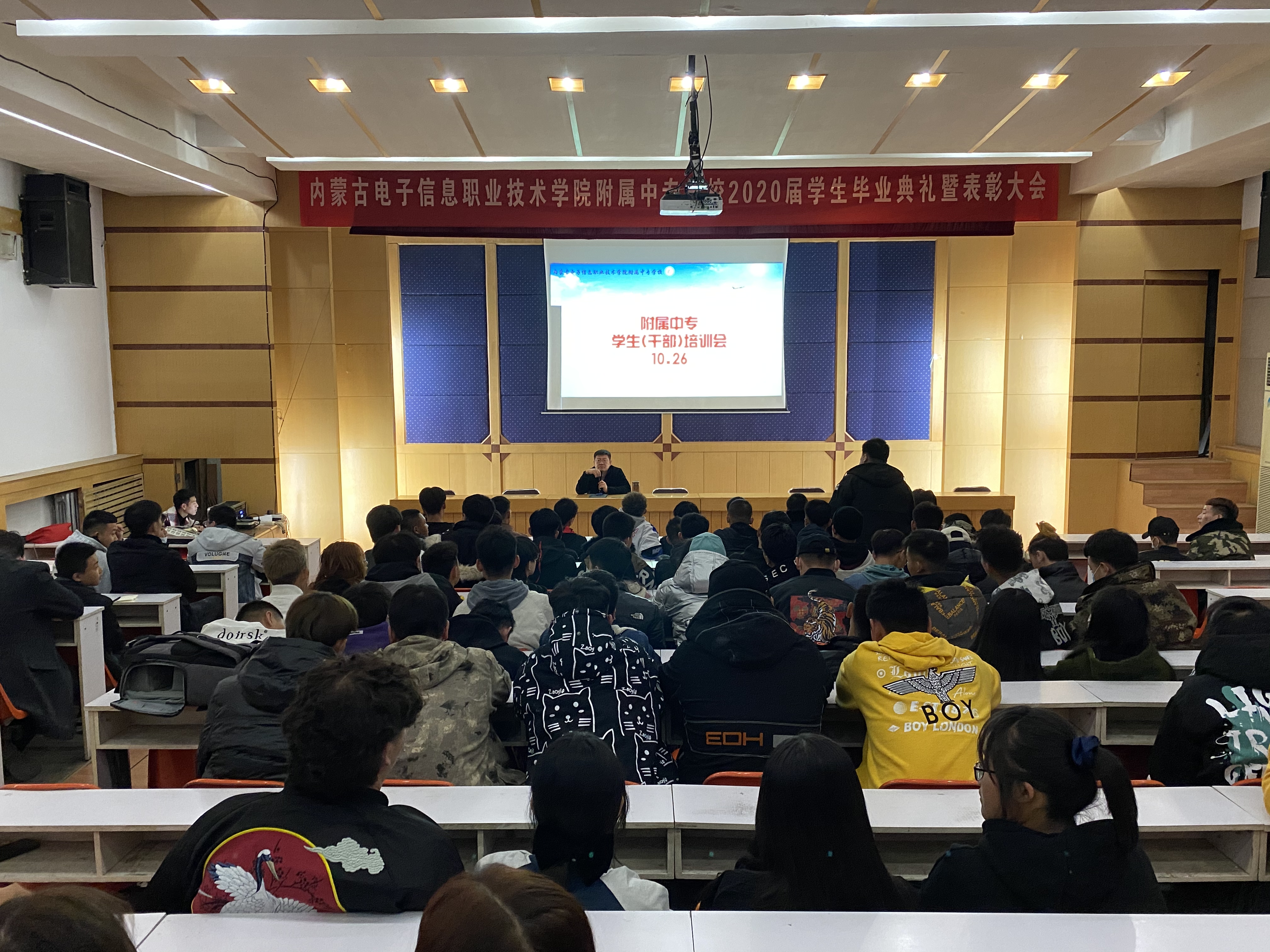 2020年10月26日19:00时,我校学生科在多功能报告厅召开了学生干部培训会,学校校长靳洪玲和辅导员郝春雨,以及各班学生干部参加了此次培训会。