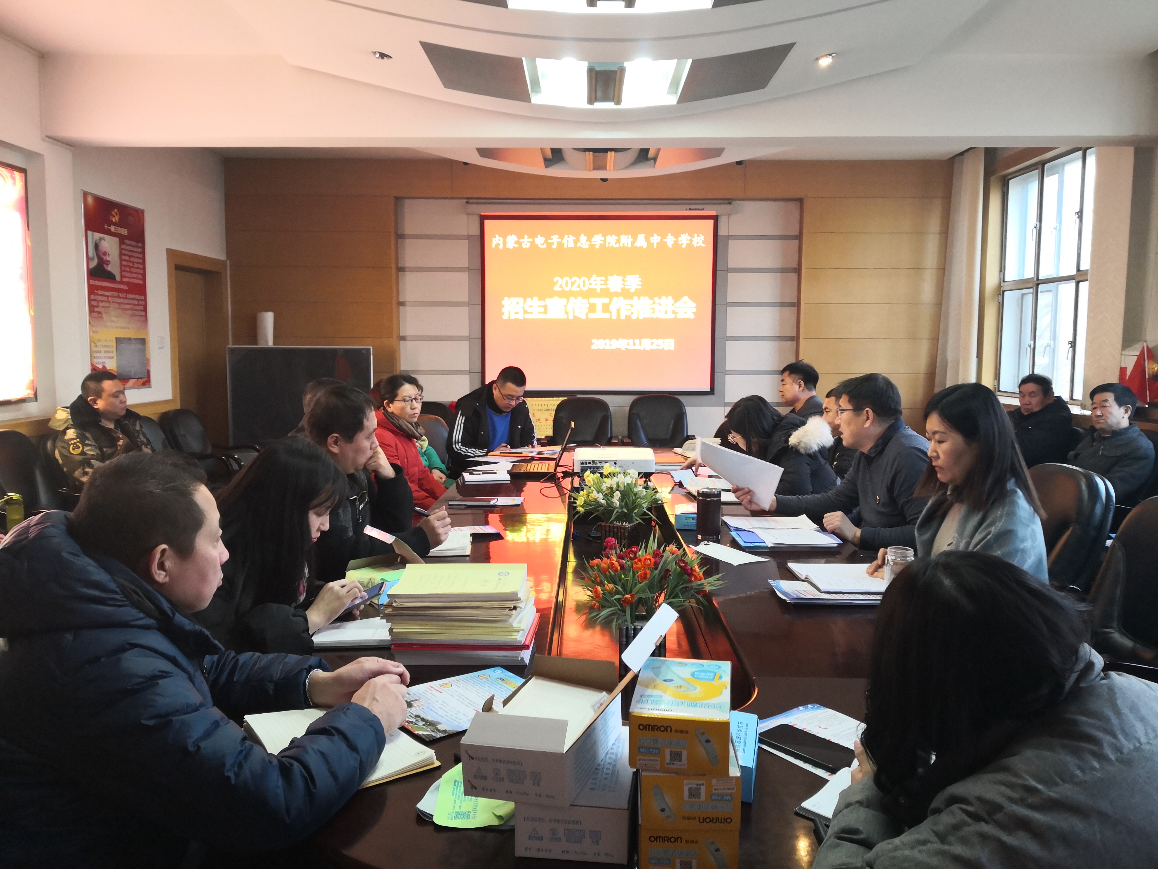11月25日,全体教职工在附属中专行政楼二楼会议室召开了2020年春季招生宣传工作推进会,会议由校长靳洪玲主持。
