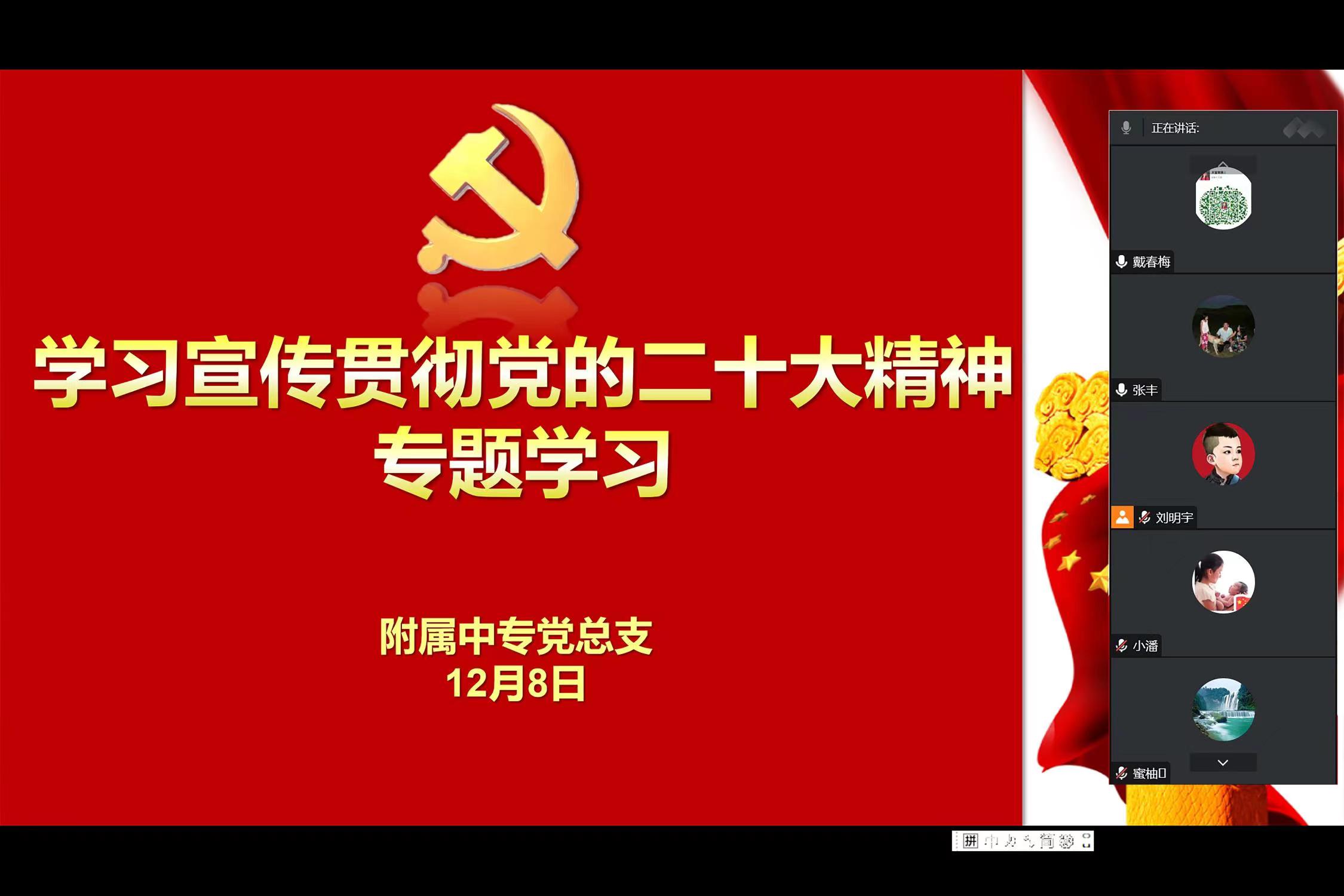 12月8日,附属中专组织全体教职工召开了党的二十大精神专题线上集中学习会,会议由党总支宣传委员刘明宇主持。