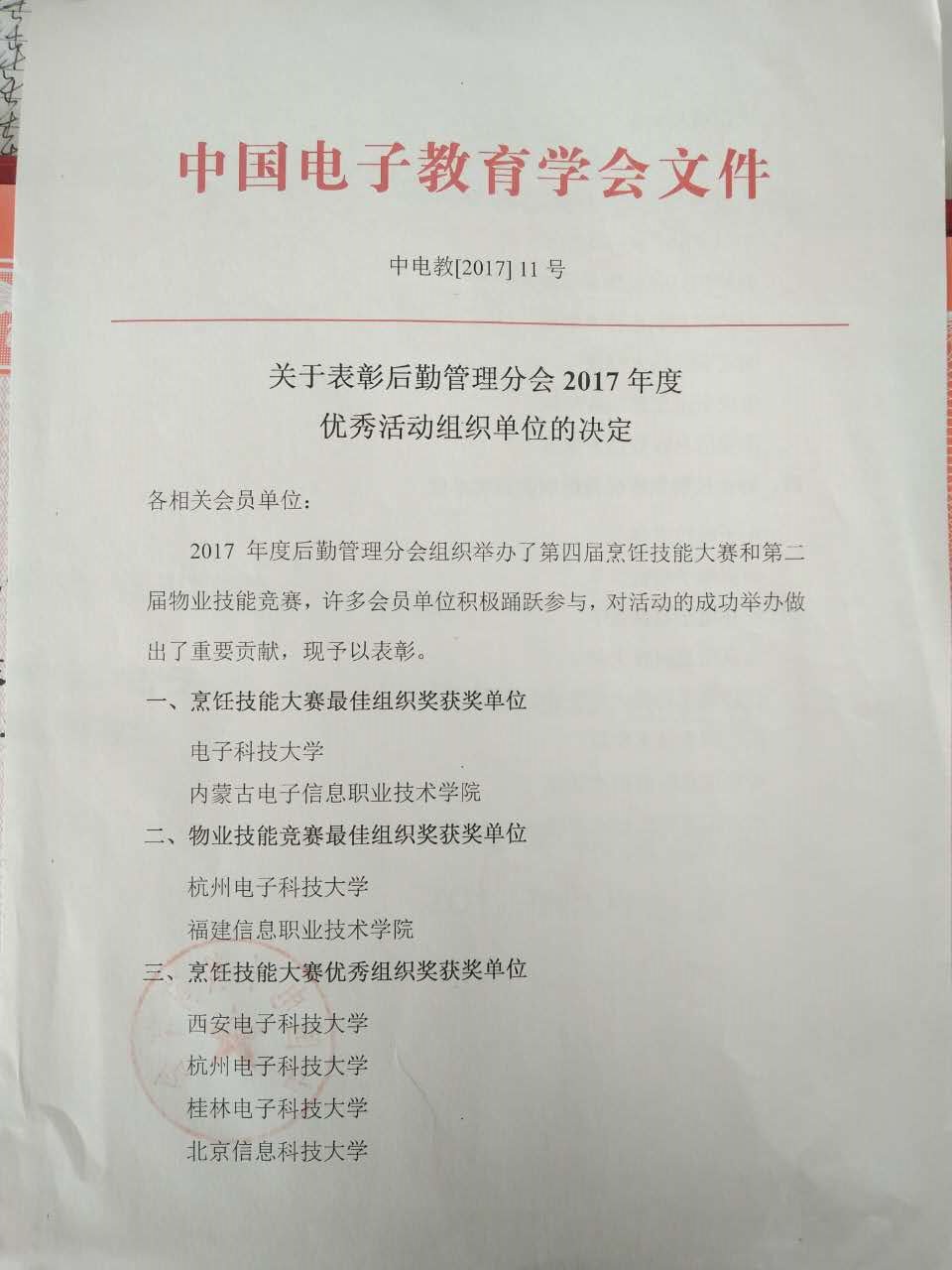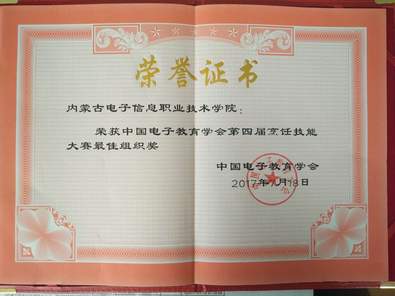 2017年由中国电子教育学会后勤管理分会主办,内蒙古电子信息职业技术学院承办的第四届烹饪技能大赛,对我院成功举办此次活动,给予“烹饪技能大赛最佳组织奖”荣誉称号。