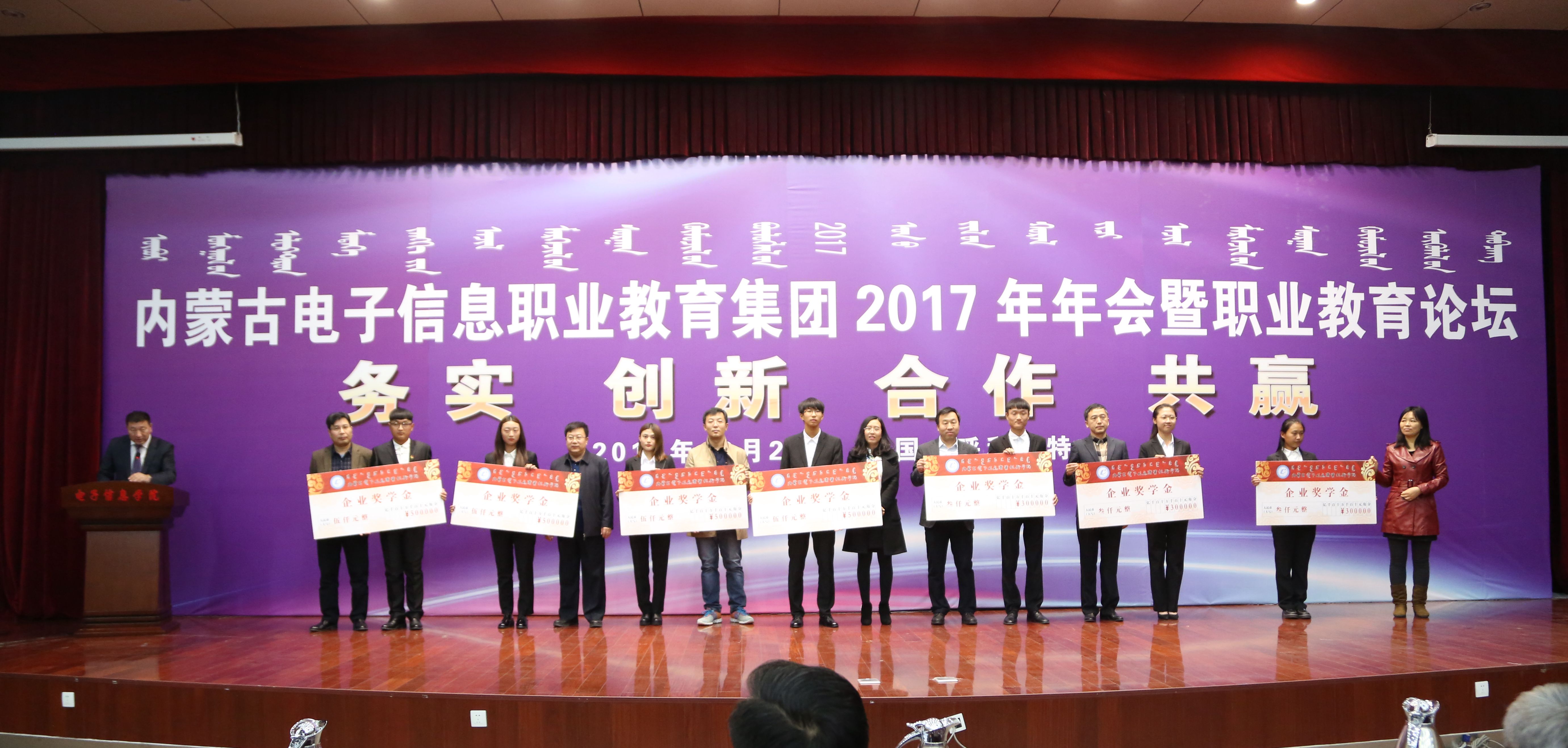 会上,江苏省昆山市人社局就业促进中心、创维电子(内蒙古)有限公司、内蒙古晶新科技有限公司、内蒙古通研电子商务有限责任公司、鄂尔多斯云泰互联科技有限公司、中国人网(北京)信息科技有限公司、内蒙古三维自动化技术应用研究所等理事单位为我院捐赠了企业奖学金,并向2017级优秀新生颁发了企业奖学金,激励他们勤奋学习、刻苦钻研,努力提高职业素养和职业技能水平。