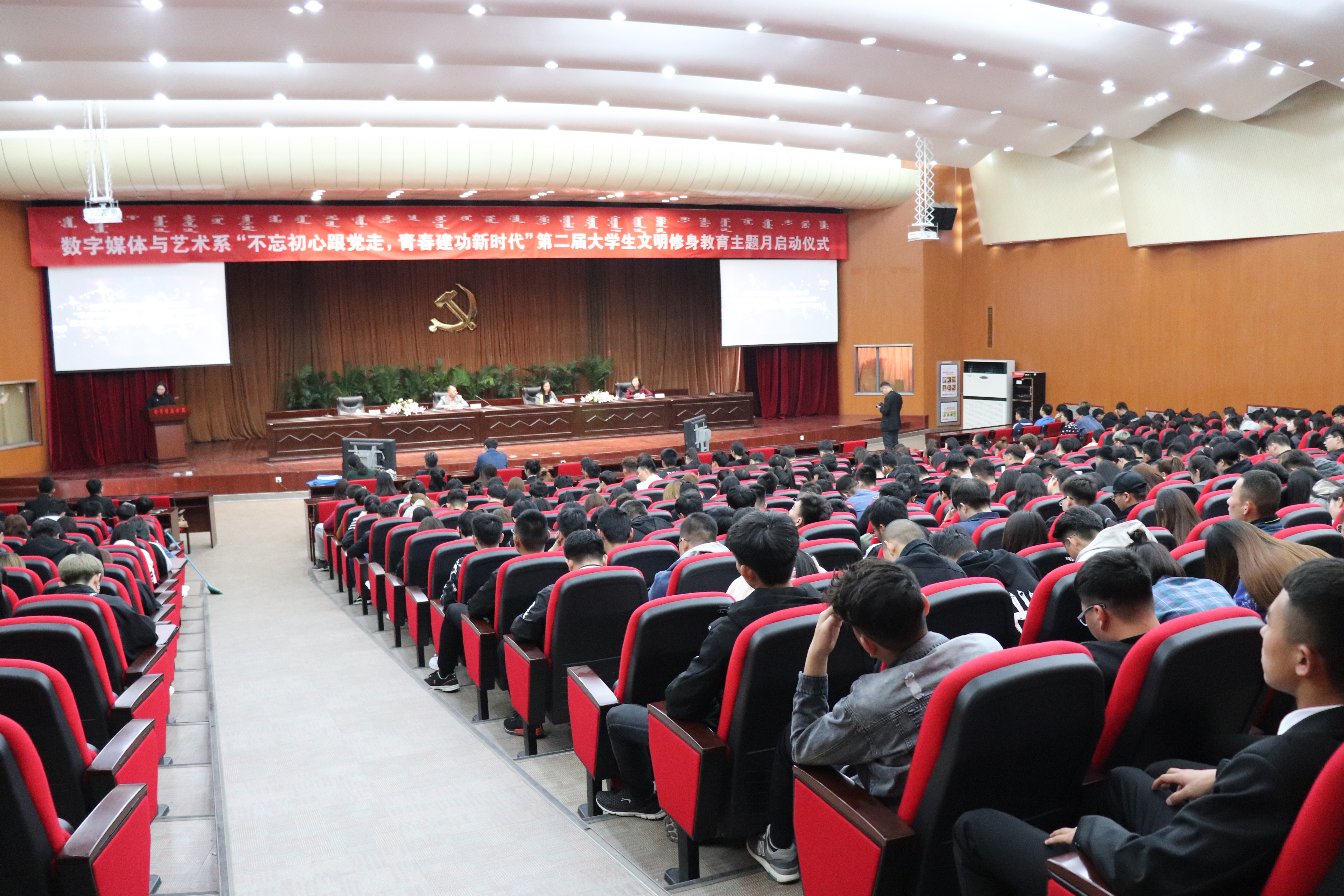 为全面贯彻党的十九大精神,以习近平新时代中国特色社会主义思想为指导。坚持立德树人,进一步做好思想引领、素质拓展工作,团结带领广大团员学生树立“四个意识”,坚定“四个自信”,积极建功新时代。数字媒体与艺术系针对学生中存在的不文明现象及行为,依托学习雷锋精神、诚信感恩教育、文明就餐等活动载体,打造校园精品活动,积极教育引导广大青年学生增强文明意识,培养文明仪表、文明习惯、文明行为。3月20日下午,数字媒体与艺术系“不忘初心跟党走,青春建功新时代”第二届大学生文明修身教育主题月启动仪式在学院一号报告厅成功举办。学院团委书记刘泽利,数字媒体与艺术系党总支书记兼主任李占岭、副主任崔娜、学生科科长兼团总支书记耿婧、全体辅导员班主任以及各班级学生参加启动仪式。