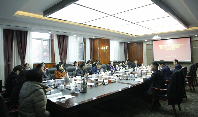 11月21日,由自治区教科文卫体工会主席温岚、副主席张国丽、自治区教科文卫体工会有关人员和各直属单位工会主席组成的自治区教科文卫体工会直属单位重点工作“互查互评互学”调研组深入我校,对我校工会年度重点工作开展情况进行检查指导。我校党委书记张鹏宇,党委委员、宣传部部长兼工会主席李占岭,工会副主席杜键炯,工会工作人员参加座谈会。座谈会由杜健炯主持。