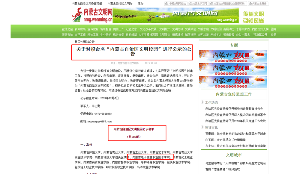 12月3日,内蒙古文明网对拟命名“内蒙古自治区文明校园”进行公示,我校榜上有名,进入公示期。