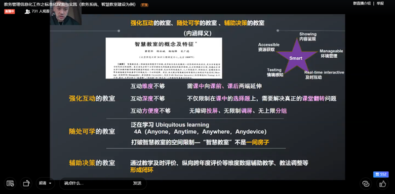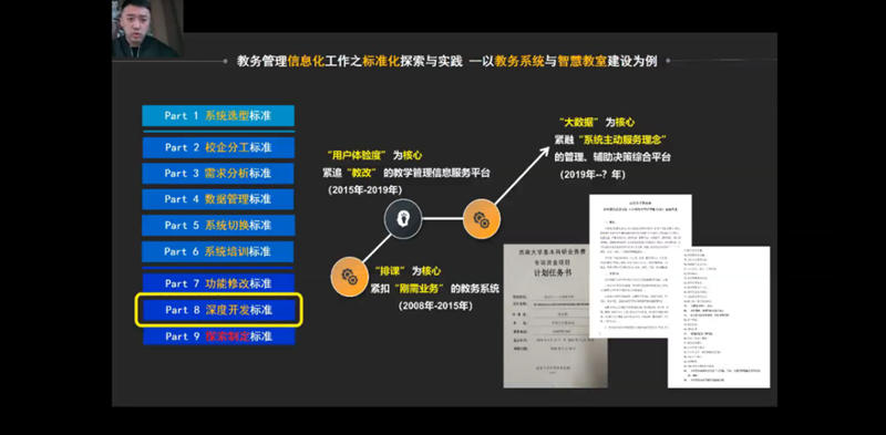 徐宏凯老师结合工作实际,以教务系统与智慧教室建设为例,从系统选型标准、校企分工标准、需求分析标准、数据管理标准、系统切换标准、系统培训标准、功能修改标准、深度开发标准和探索制定标准等9个方面进行了教学管理信息化之标准化探索与实践的讲解,既有标准化流程的介绍,也有标准化理念的阐述,还有教学运行管理经验的分享。