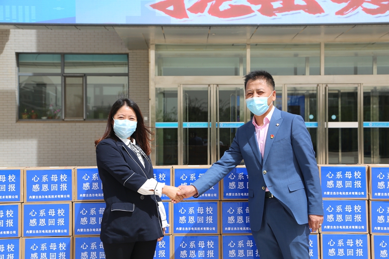 5月12日上午, 学校中专时期96五班无线电专业毕业生段梅带领她的公司成员回到学校捐赠防疫物资。段梅,现为内蒙古杰尔电讯技术有限公司总经理,在得知学校即将复课后,为学校捐赠一次性医用口罩3000个,消毒液50件,消杀喷壶30个。党委委员、宣传部部长兼工会主席李占岭代表学校接受了捐赠。