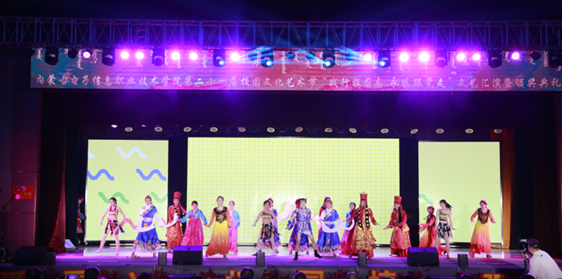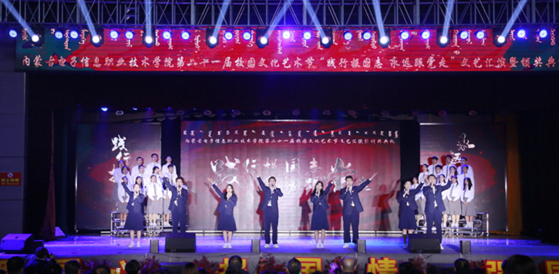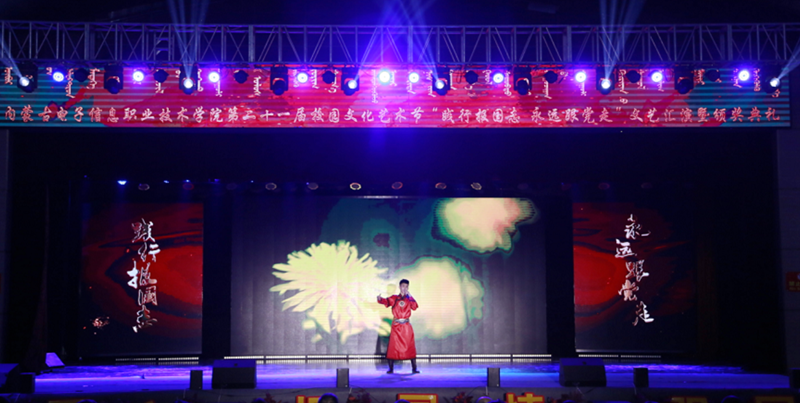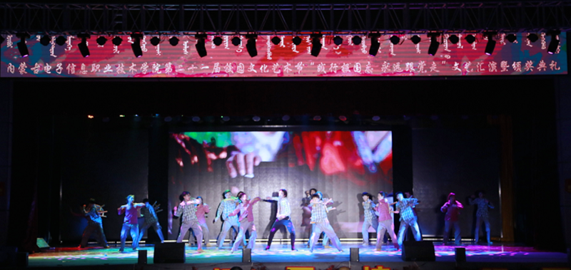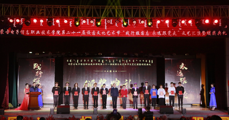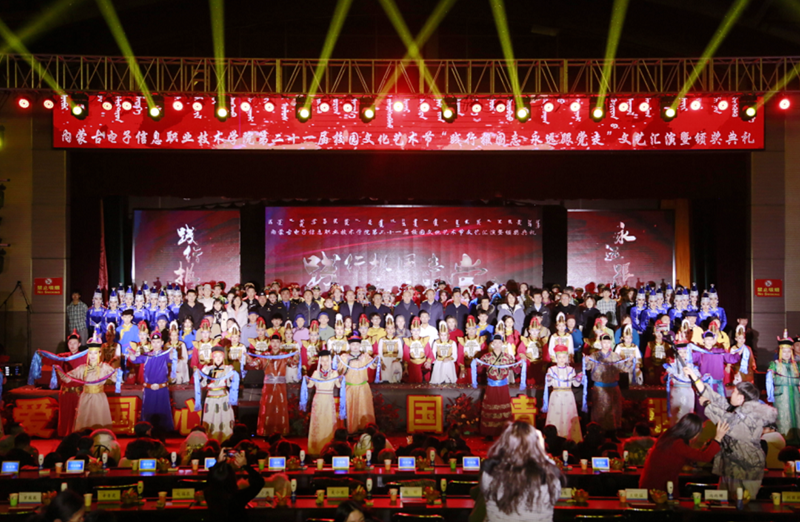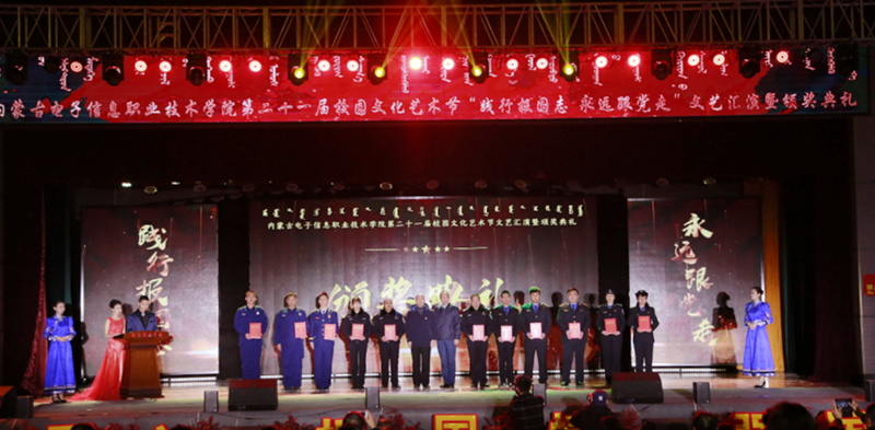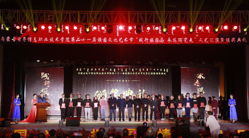 12月7日19:00,内蒙古电子信息职业技术学院“践行报国志 永远跟着党走”第二十一届校园文化艺术节文艺汇演暨颁奖典礼在我校文体馆圆满落幕。自治区党委理论宣教处处长王红凌、自治区教科文卫体工会副主席张国丽、呼和浩特市新城区创新创业服务中心副主任高娃、内蒙古和林格尔新区管委会人事科长陈雷、赛罕区公安分局大学城派出所所长赵建国等各行政执法和消防单位负责人、内蒙古晶新科技有限责任公司董事长张日新、内蒙古TCL光电科技有限公司务副总经理雷磊等职教集团企业代表,我校党委书记李向东、校党委副书记、校长王生铁等党委领导班子一并出席活动,赛罕区公安分局大学城派出所部分民警、消防中队的官兵们同学校各部门、各二级学院和附属中专师生观看了精彩纷呈、美妙绝伦的演出。