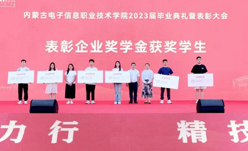 恩和门德宣读《关于表彰2022-2023学年在校生企业奖学金获得者的决定》。内蒙古杰尔电讯技术有限公司总经理段梅,创致云(内蒙古)人工智能科技有限公司 总经理 赵瑞君,内蒙古科特企业管理咨询有限公司运营总监刘芳为获奖学生颁发了奖金。