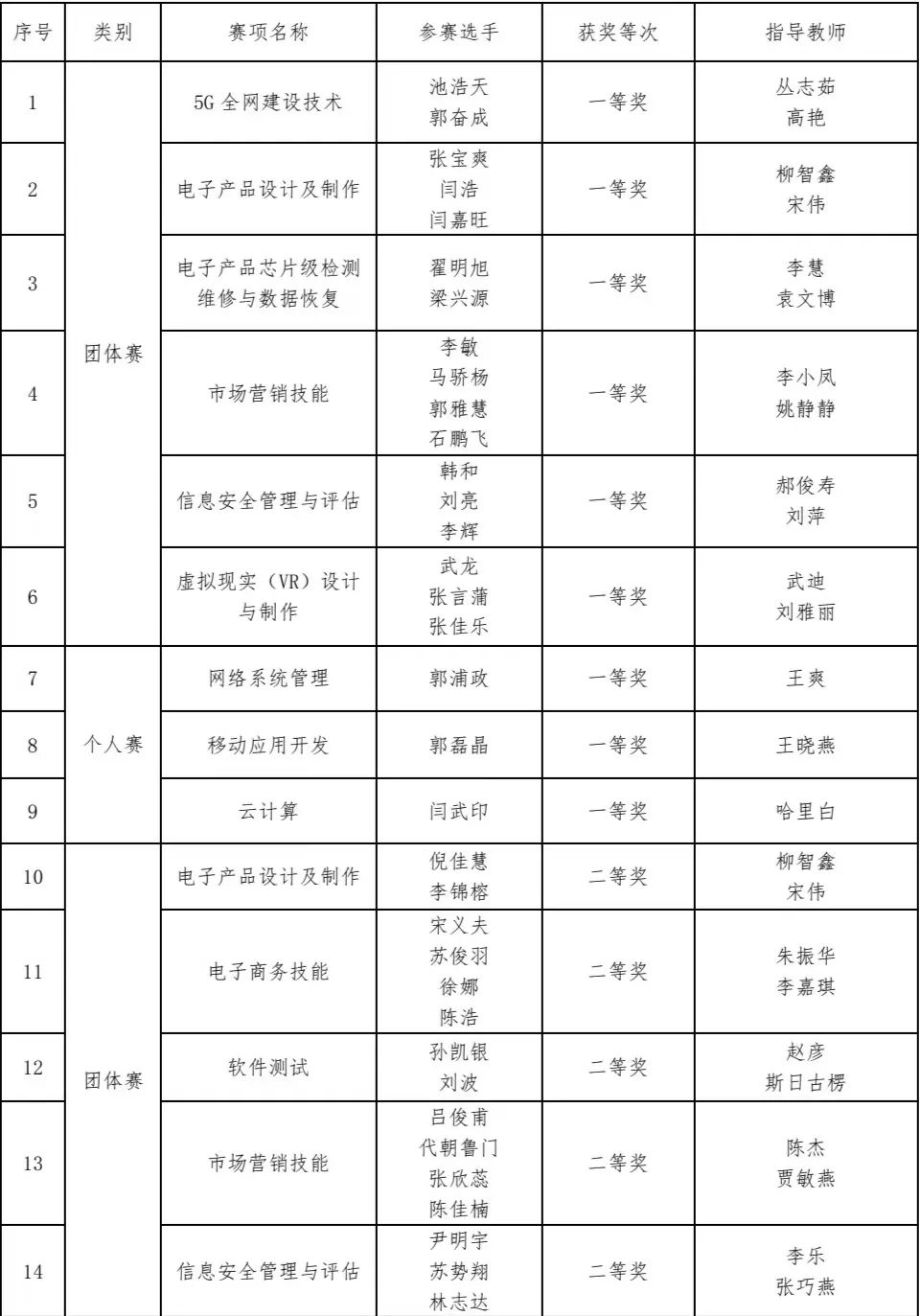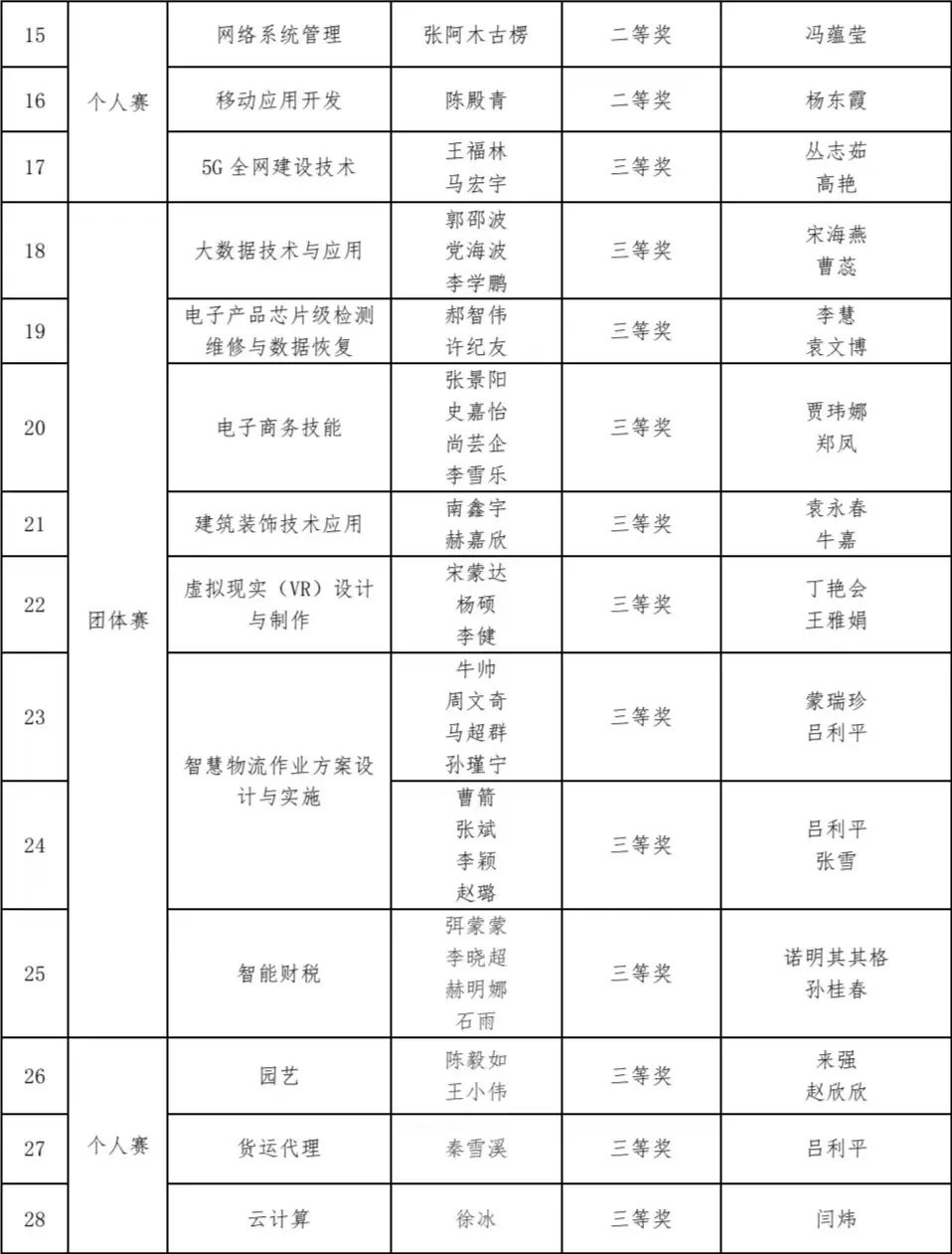 近日,自治区教育厅公布了2023年春季学期全区高等职业院校学生技能大赛获奖名单,我校参赛学生取得优异成绩,荣获一等奖9项(其中团体赛6项,个人赛3项,15位指导教师荣获“优秀指导教师”荣誉称号)、二等奖8项(其中团体赛5项,个人赛3项)、三等奖11项(其中团体赛8项,个人赛3项)。2023年春季学期全区高等职业院校学生技能大赛获奖名单