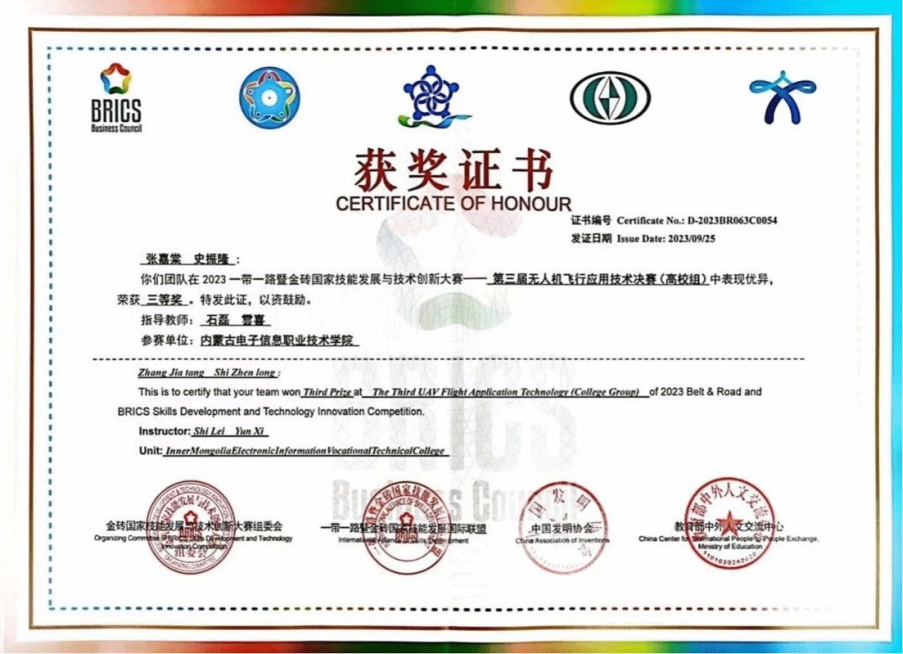来自全国13个省份22所院校的33个代表队66名选手围绕该赛项五个模块进行了为期两天半的角逐。我校电子与自动化学院石磊、雲喜老师指导,张嘉棠、史振隆同学组成的代表队总成绩排名第7,荣获2023一带一路暨金砖国家技能发展与技术创新大赛—第三届无人机飞行应用技术决赛(高校组)三等奖。
