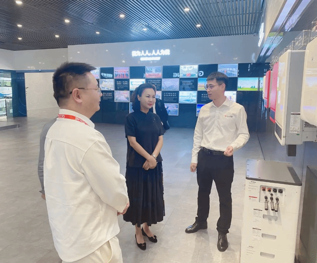 在江苏伟创晶集团总经理丁基勇、教育研究院主任程卫卫,固德威技术股份有限公司业务营销中心战略营销部门经理赵星宇、业务销售中心大客户经理姚建涛、高级解决方案工程师杨健、解决方案工程师杨毅劼等陪同下,李春燕一行实地参观了固德威技术股份有限公司生产车间等。