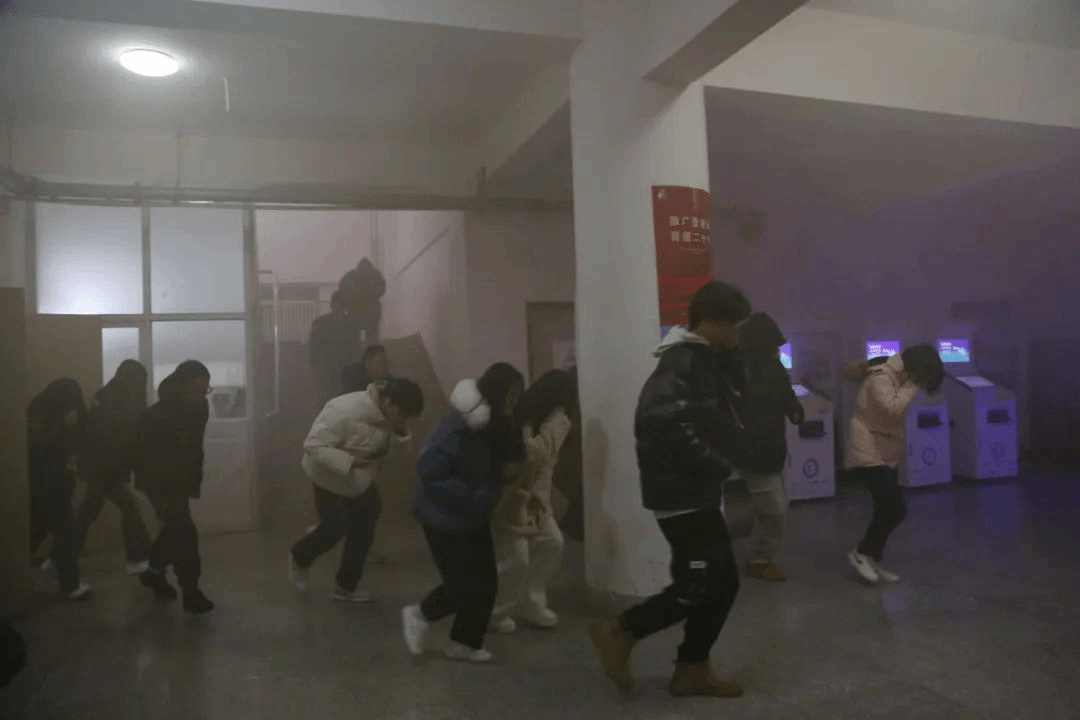 培训会后,消防安全疏散演练正式开始,在实训楼A座实验室内模拟了因电源过载引起“火情”的场景。随着楼梯间内冒出阵阵“浓烟”,师生们在实验室安全管理人员的组织下,听从指挥、紧张有序、快速撤离了各个楼层,整个演练井然有序,达到了预期效果。