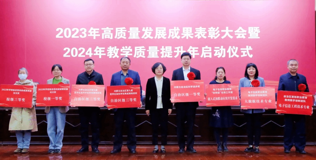 笃行奋楫,赓续新篇。4月9日下午,学校举行2023年高质量发展成果表彰大会暨2024年教学质量提升年启动仪式,隆重表彰2023年在教书育人、人才培养、科学研究等岗位上做出突出贡献的优秀教师。学校党委书记李春燕出席并讲话。学校党委副书记、校长林民主持大会。学校党委副书记刘建英,学校党委委员、副校长郑志丽、恩和门德、秦婷,学校党委委员、纪委书记王学民,学校党委委员、组织部(统战部)部长兼党政办公室主任王凤岐,全体教职工及学生代表参加大会。